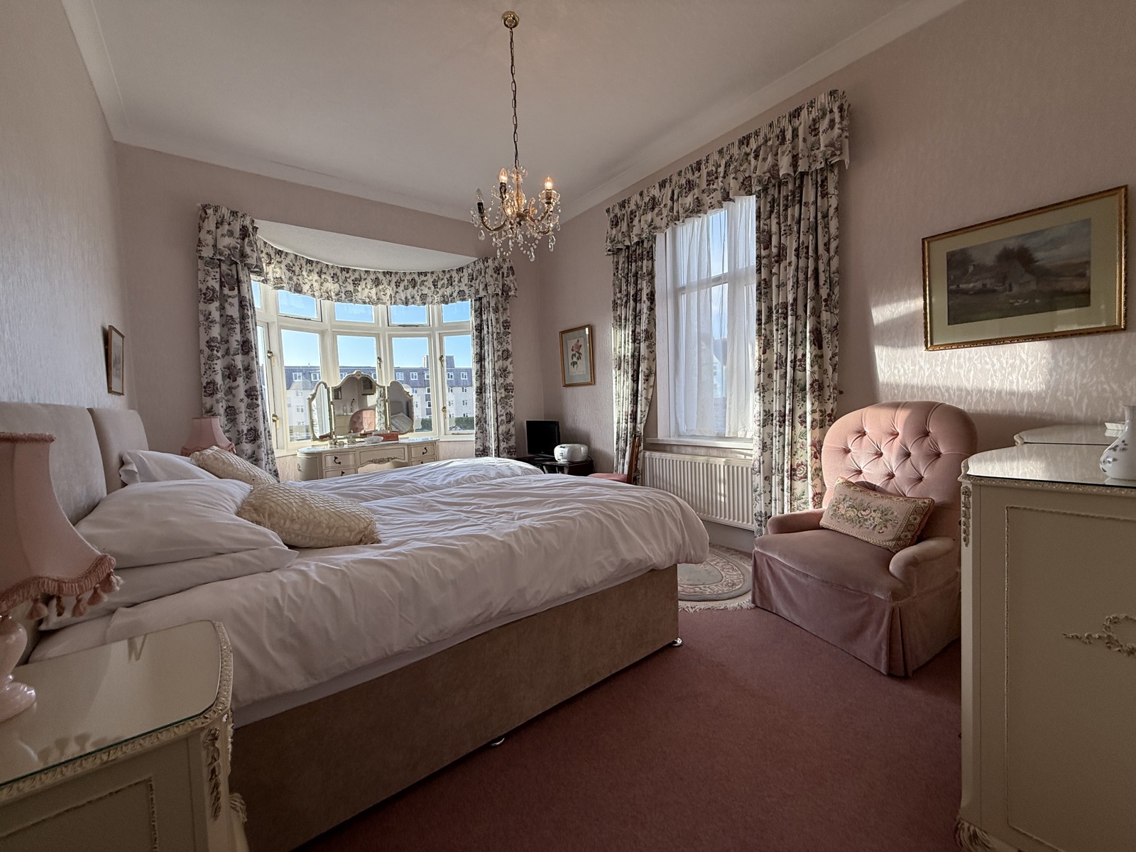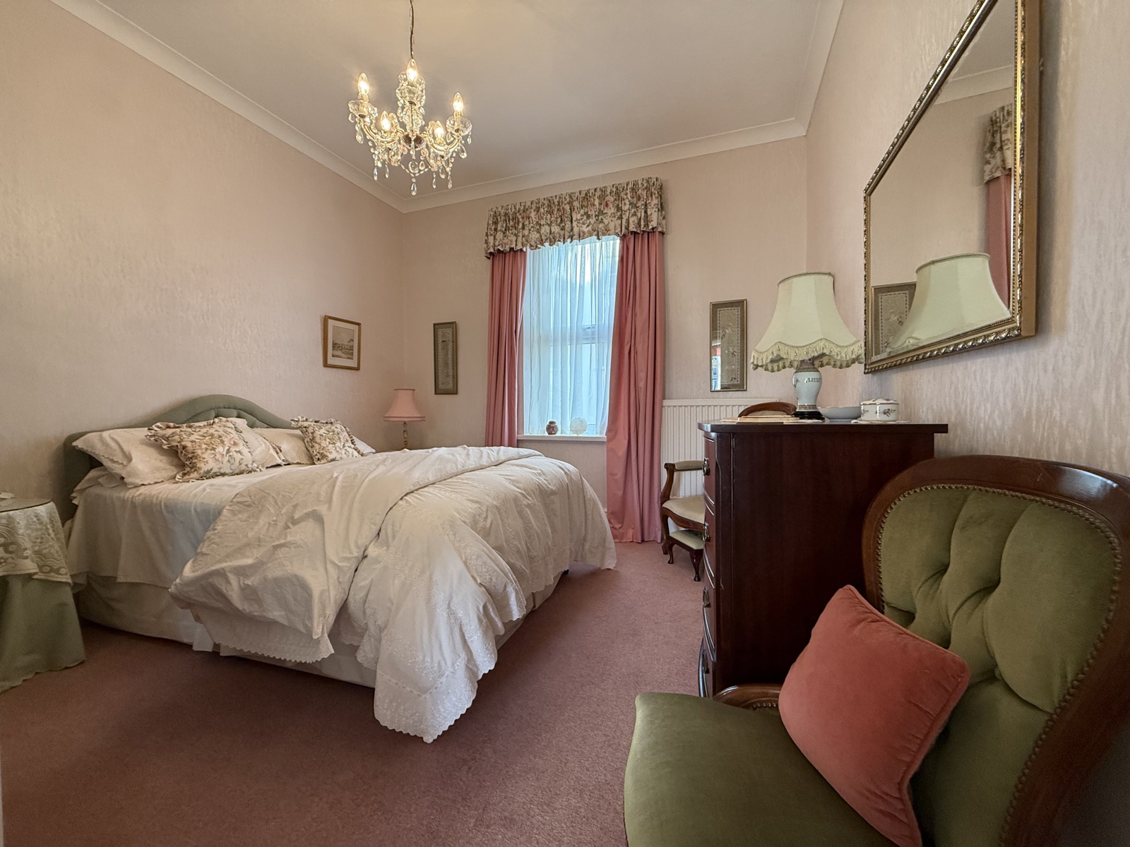 Large double glazed UPVC window overlooking Tenby’s bowling green, double glazed UPVC window, radiator, light pink carpet throughout.