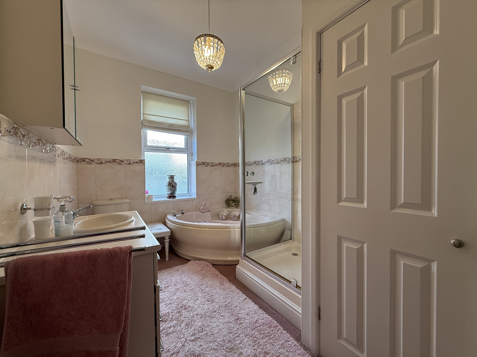 Double glazed obscured UPVC window, Large ivory vanity unit with underneath storage, wall mounted mirrored cabinet, partially tiled walls, large storage cupboard housing water tank and ample shelving, corner bath, shower cubicle with glass screen, light pink carpet throughout.