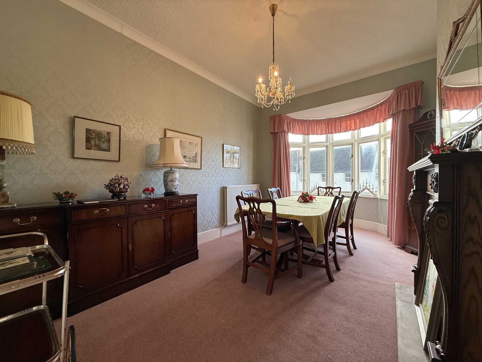 Large single glazed bay window overlooking the beautiful views of Tenby bowling green, quartz fireplace adding a characteristic feature, light pink carpet throughout and radiator.