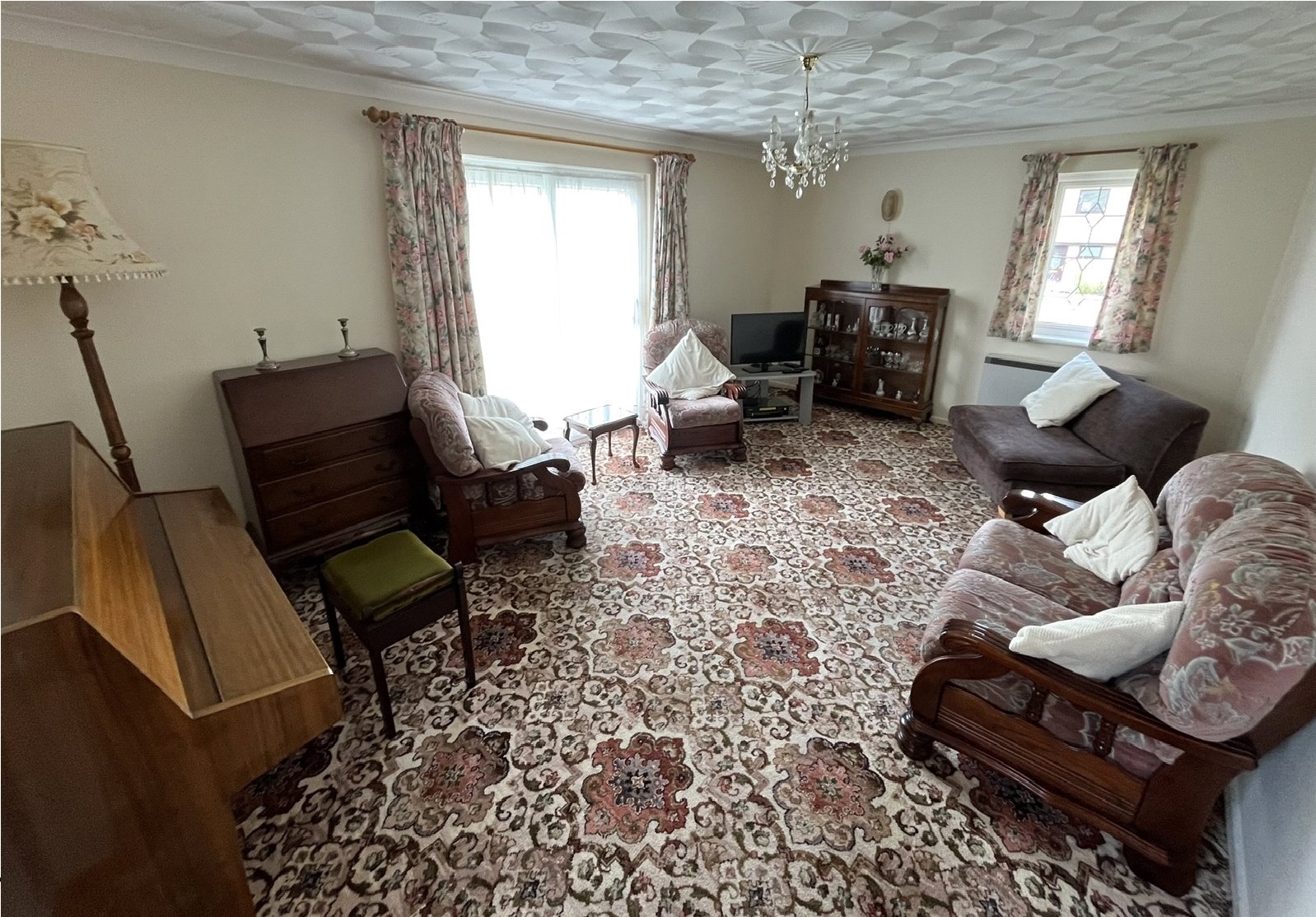 Large family lounge, with double-glazed sliding doors to the fore and uPVC double-glazed windows to each side aspect, electric storage heater, lighting and carpeted flooring.