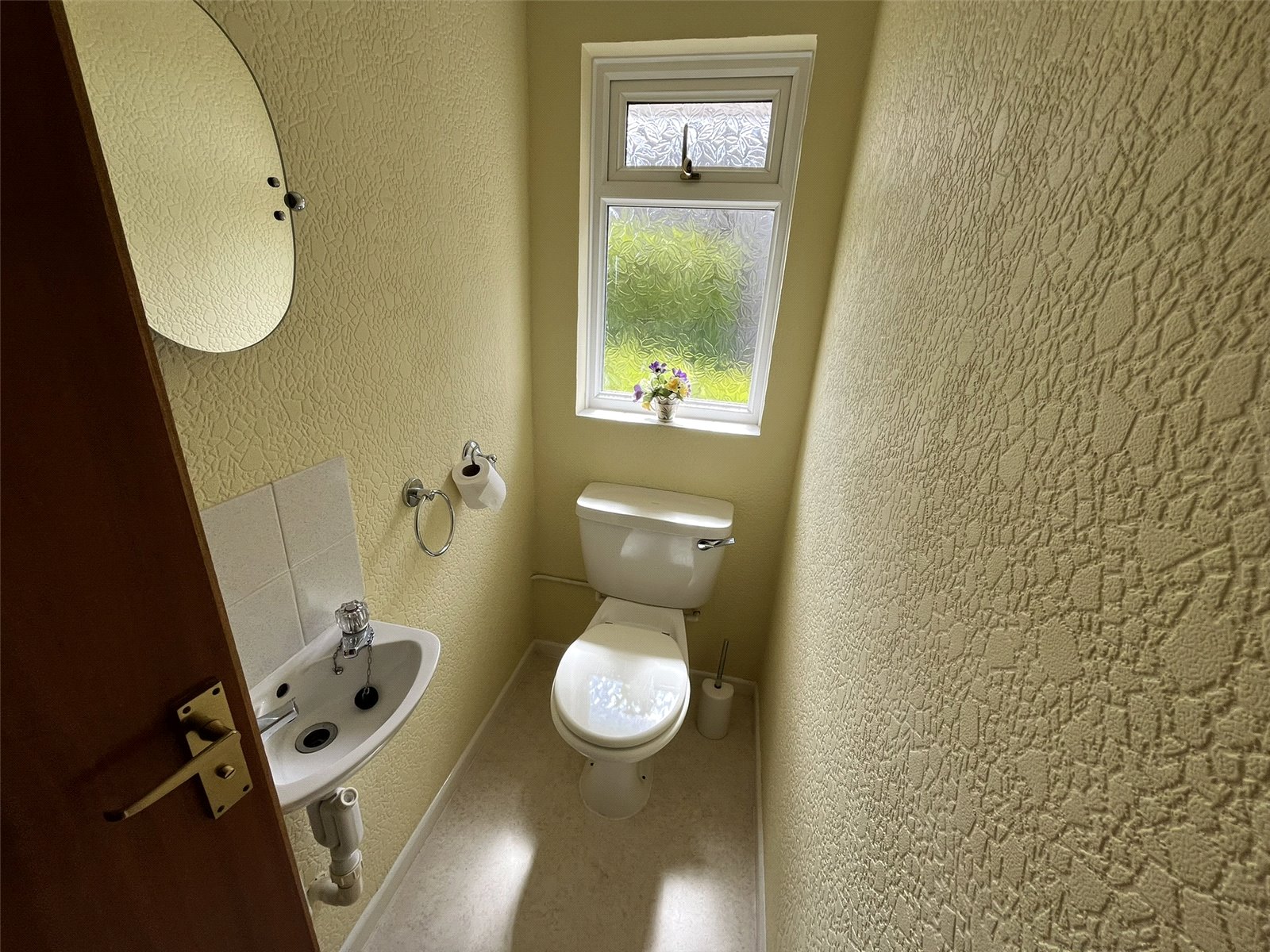Separate w/c with close-coupled toilet, wash basin, tiled splashback, lighting, vinyl flooring and rear-facing obscure uPVC double-glazed window.
