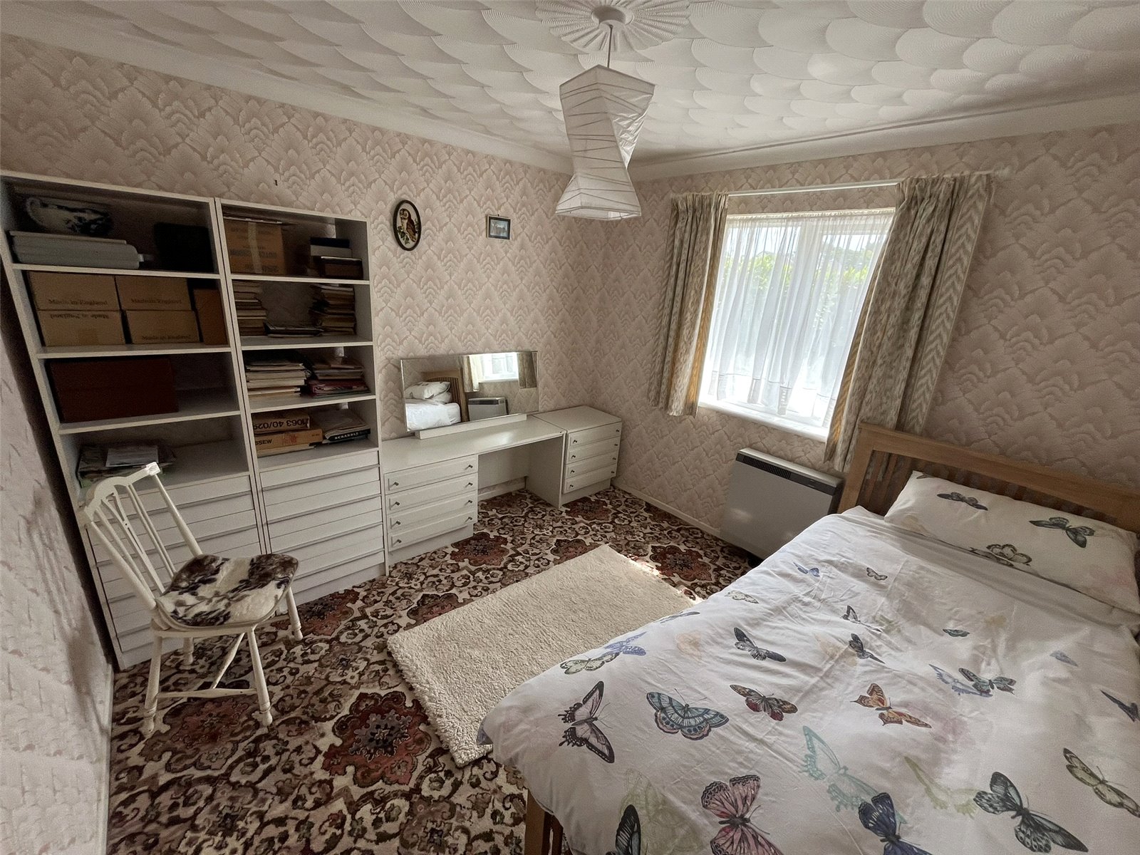 Rear-facing double bedroom with uPVC double-glazed window, carpeted flooring, lighting and electric storage heater.