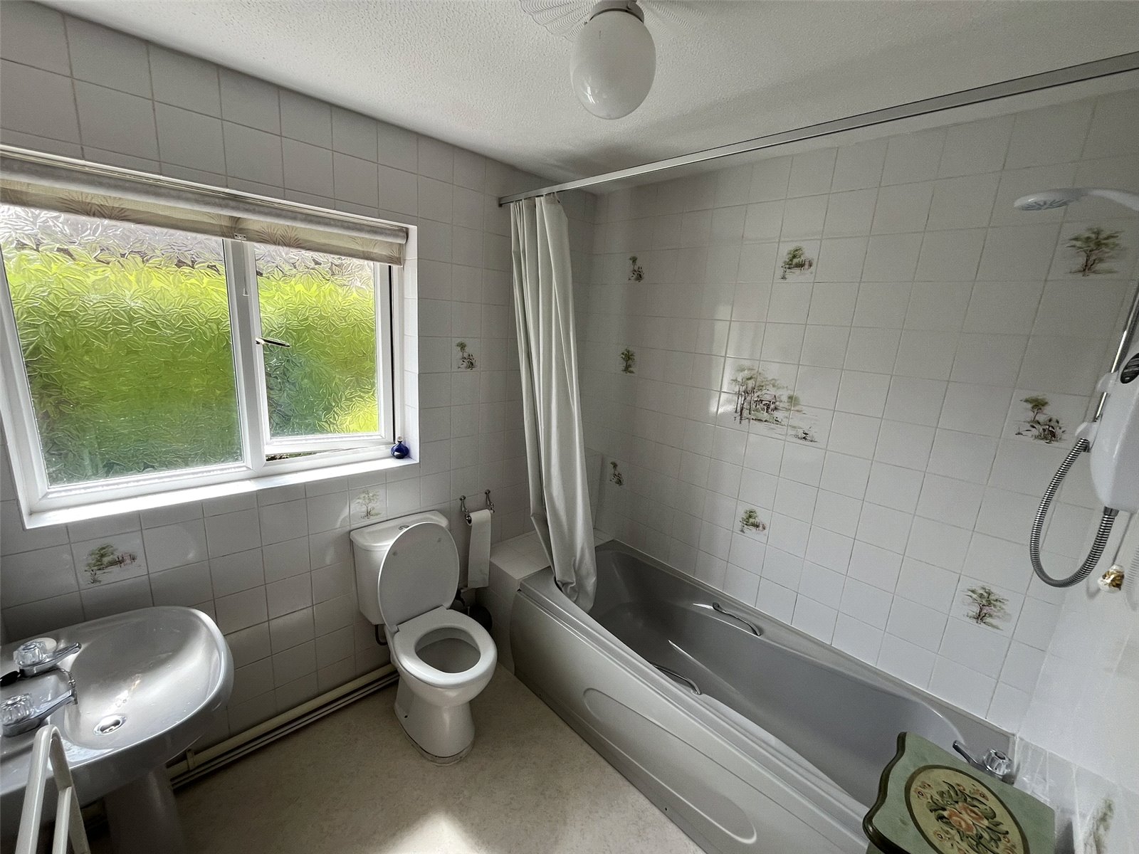 Family bathroom comprising of bath with electric shower over, pedestal wash basin, close-coupled w/c, heated towel rail, vinyl flooring, tiled walls throughout and rear-facing obscure glass uPVC double-glazed window.
