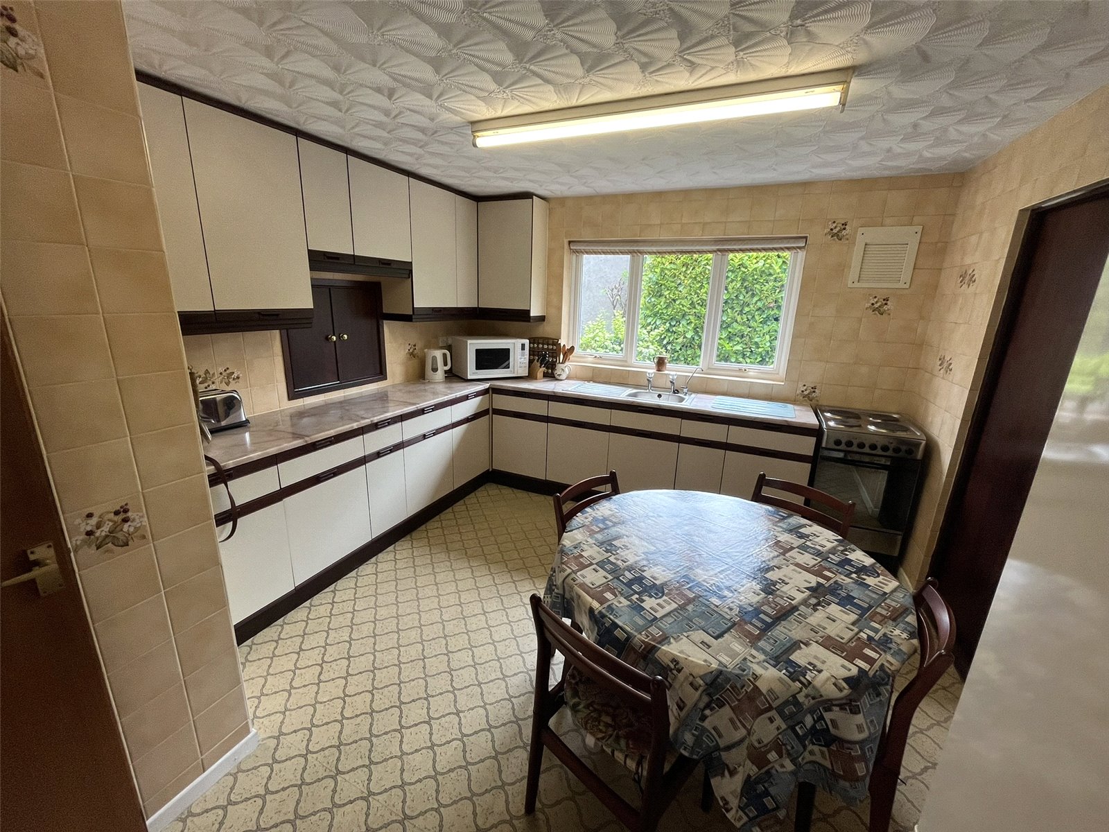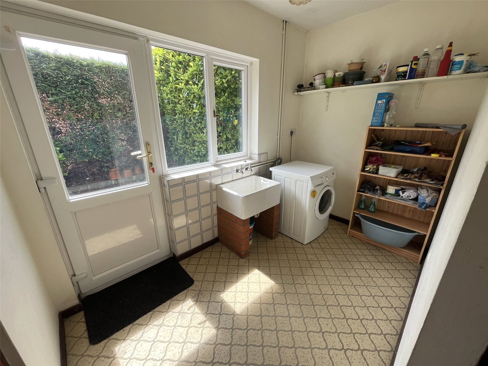 Handy utility space, benefitting from plumbing and space for washing machine and dryer, as well as Belfast sink, vinyl flooring, uPVC double-glazed door and window to rear garden and lighting. There is a currently inactive mains gas line to the utility, allowing for potential for installation of gas central heating.