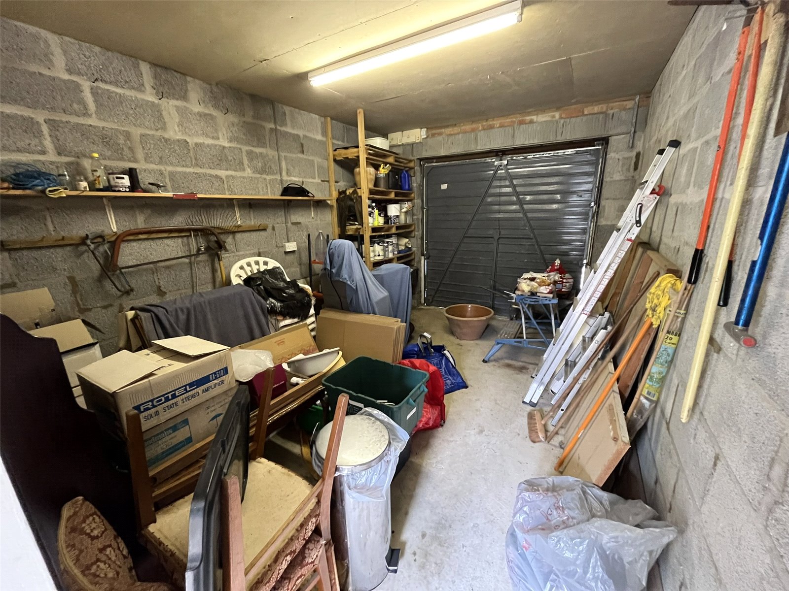 Sizeable single garage space, with steel up & over door to the fore, power and lighting and loft hatch.