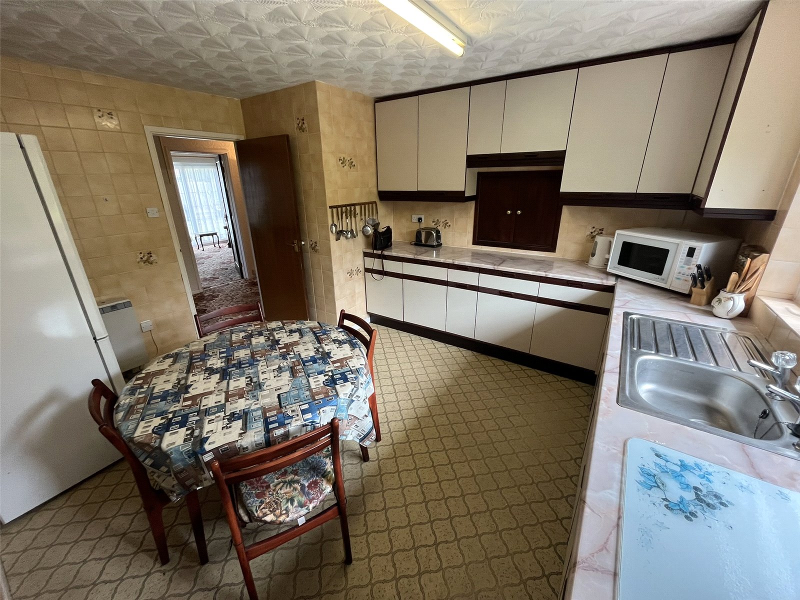 Kitchen/diner area benefitting from a range of solid wood base & wall units, with integrated stainless steel sink & drainer, uPVC double-glazed window to rear, lighting, electric storage heater, vinyl flooring, serving hatch to dining room and access to;