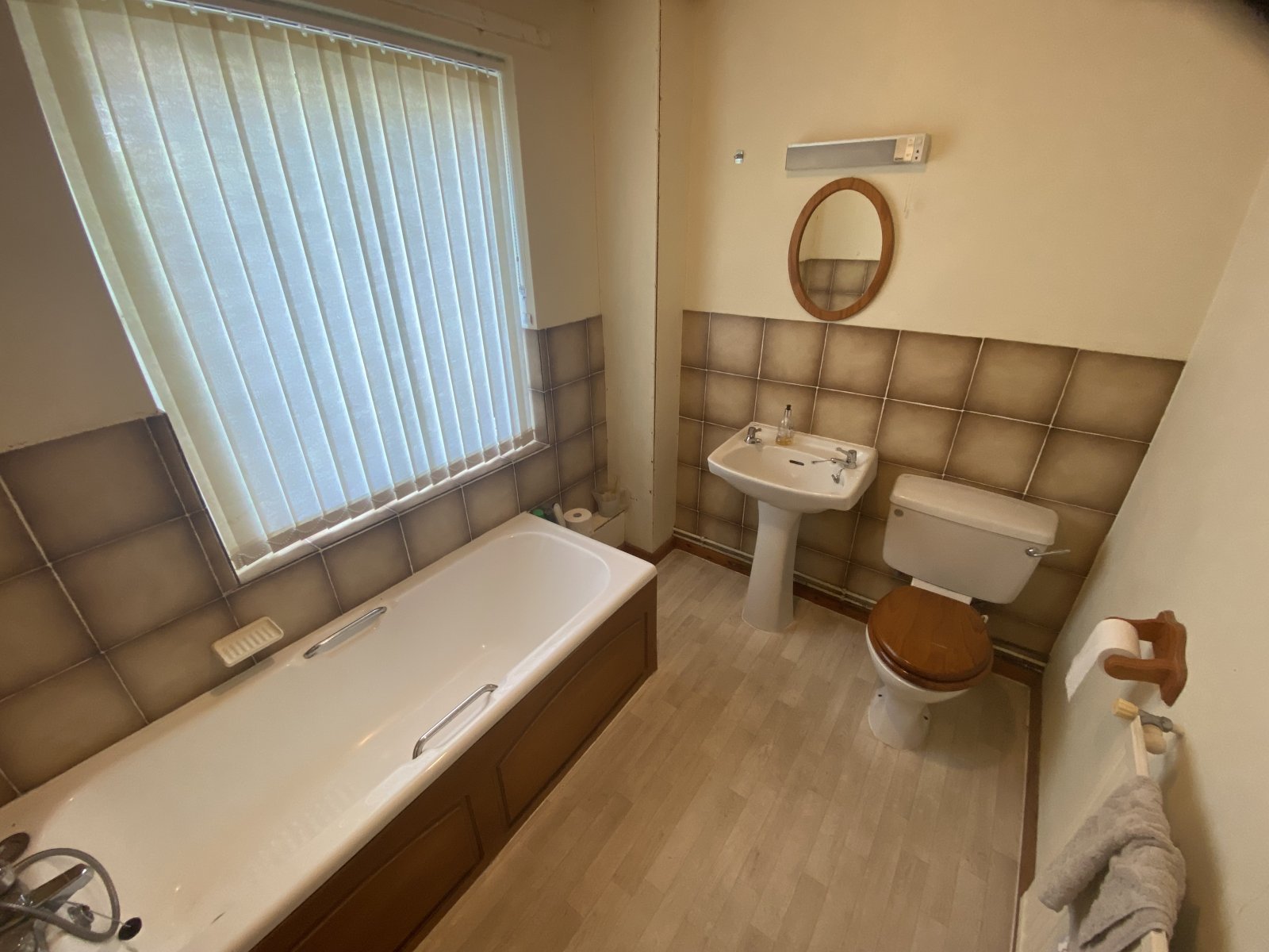 Coloured bathroom suite, bath, WC, WHB, vinyl flooring.