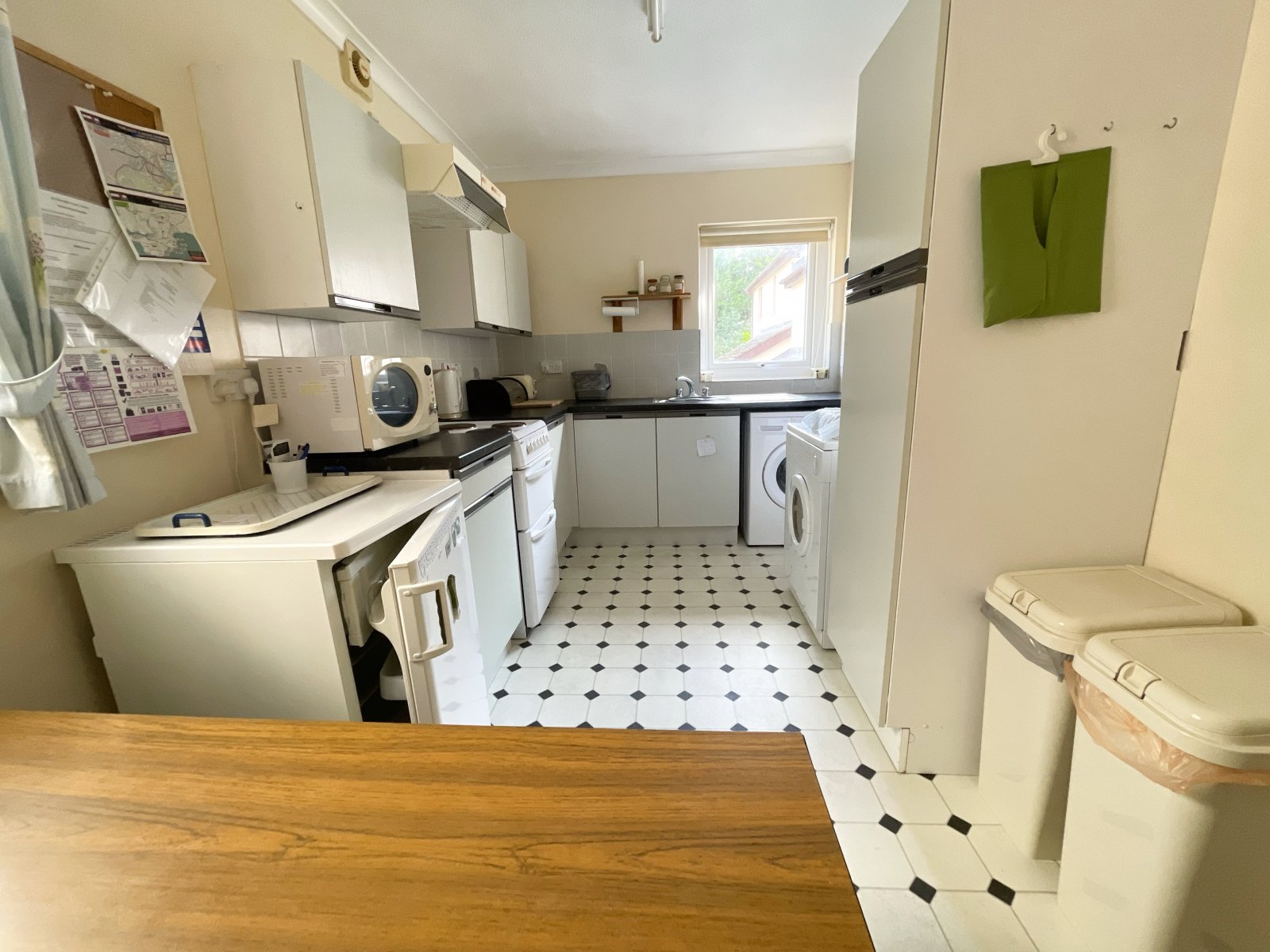 Vinyl flooring, range of base and eye level units, tile splashback, sink and drainer, space for cooker, washing machine, fridge, freezer and tumble dryer, airing cupboard housing 2 immersion heaters (one off-peak and one always available), both newly installed in 2021, always available electric heater, 2x double glazed uPVC windows.