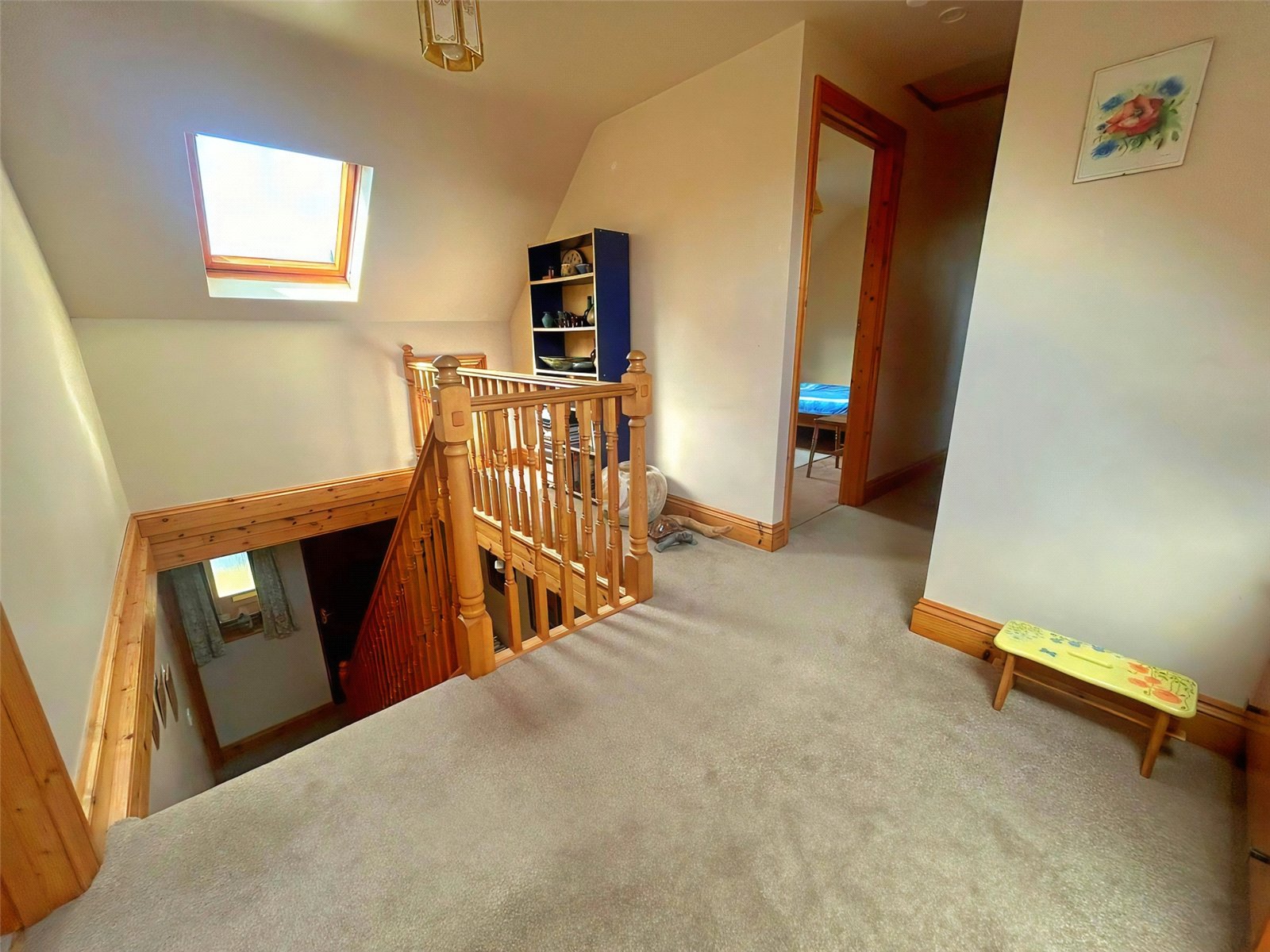 A bright and airy first-floor landing with a vaulted ceiling and a skylight that floods the area with natural light. The space features a continuation of the wooden staircase and provides access to the bedrooms, including the main bedroom suite. It is a welcoming and practical space that connects the upper-floor rooms.