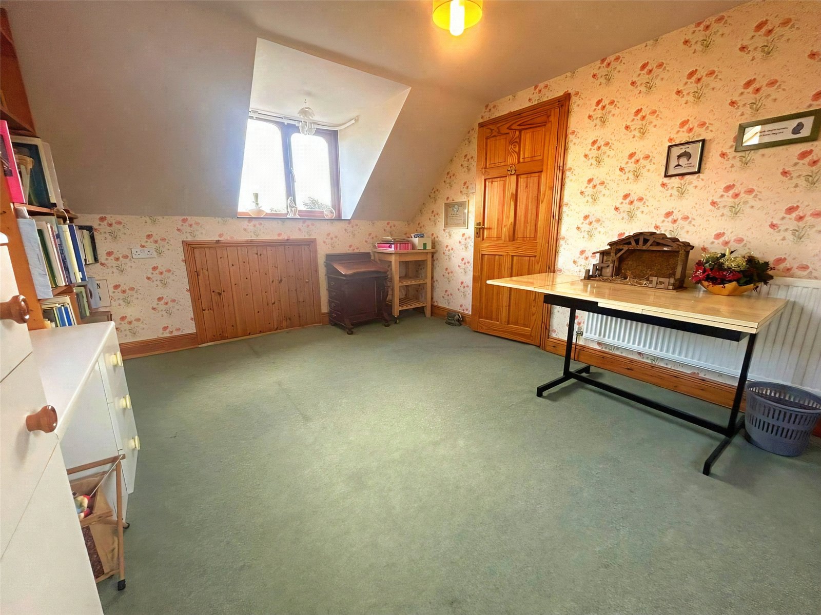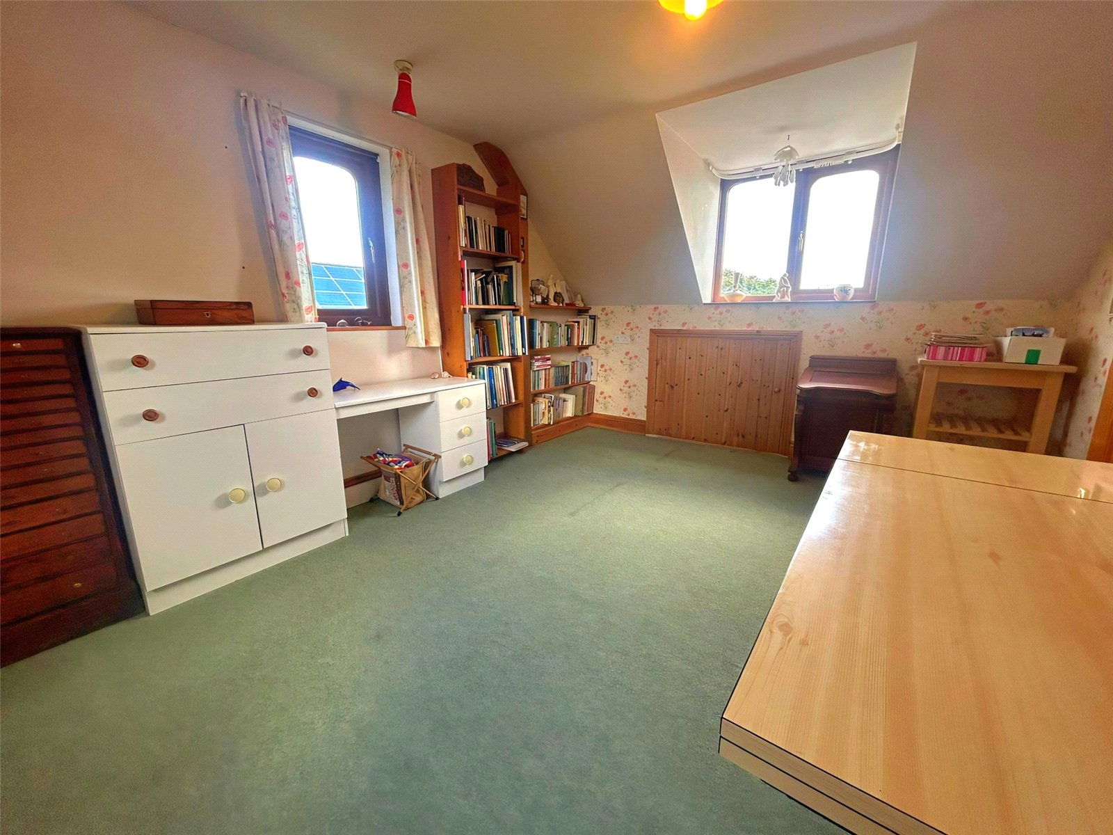 This highly versatile room, currently configured as a home office/study, could easily serve as an additional bedroom. Benefitting from natural light via two windows, characterful sloped ceilings, and a central heating radiator, it offers adaptable space for a variety of uses to suit a new owner's needs.
