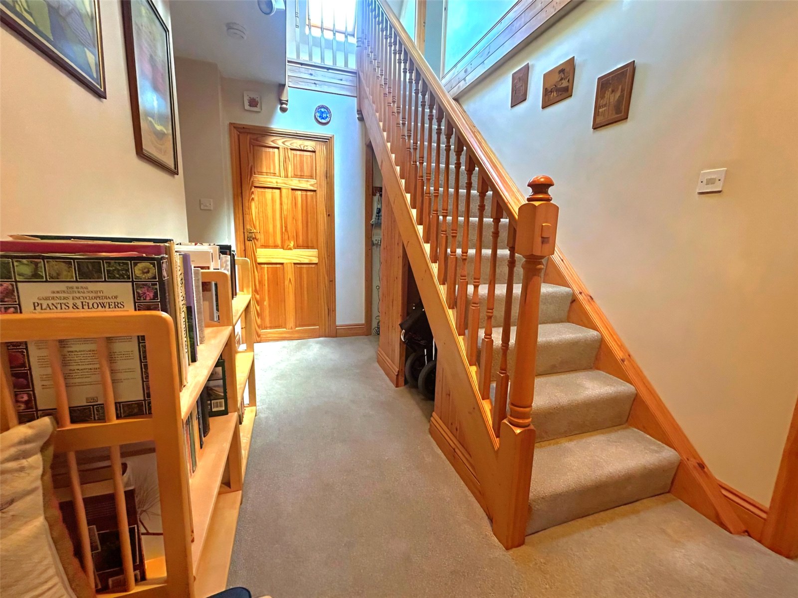 A warm and inviting hallway featuring a light wood staircase with a fitted carpet, leading to the first floor. The hallway is neutrally decorated, with a natural wood door and a practical under-stairs storage area. There is a small window at the top of the stairs, allowing natural light to flood the space.