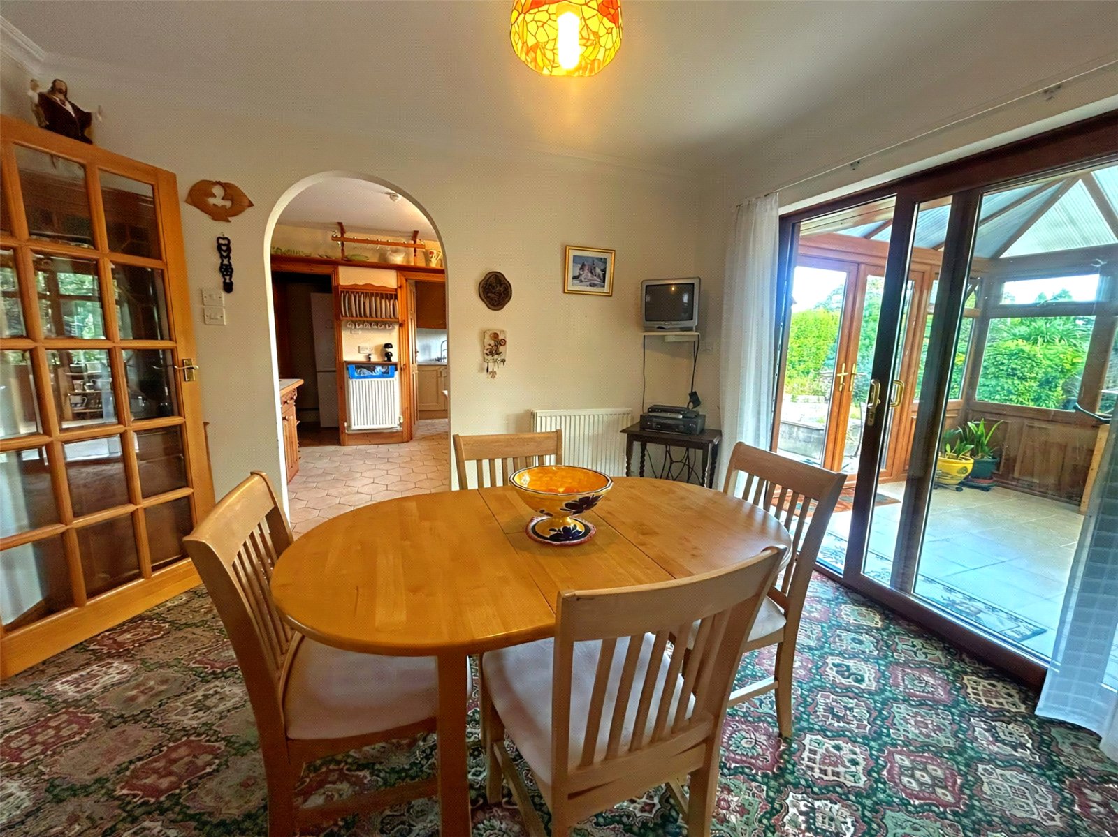 A bright and welcoming dining room with a seamless flow. The room features sliding doors that lead out to a lovely sunroom, filling the space with natural light. An archway connects the dining room to the kitchen, creating a social and practical layout for family meals and entertaining.