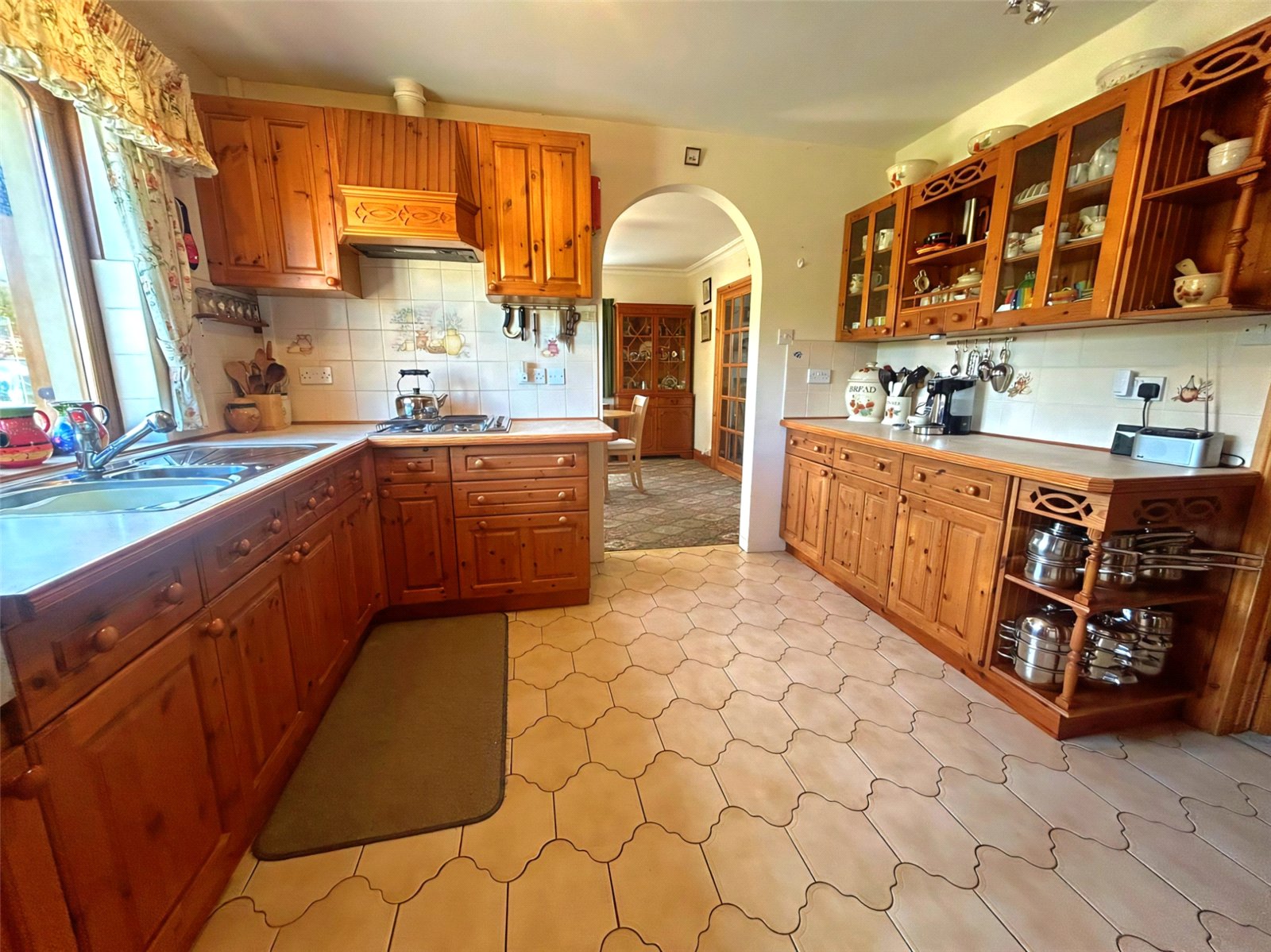 A spacious and practical kitchen with a range of solid wood base and wall units. The space is equipped with an integrated double oven and a gas hob, with ample worktop space for food preparation. An archway leads directly into the dining room, making it an ideal space for daily family life and entertaining.