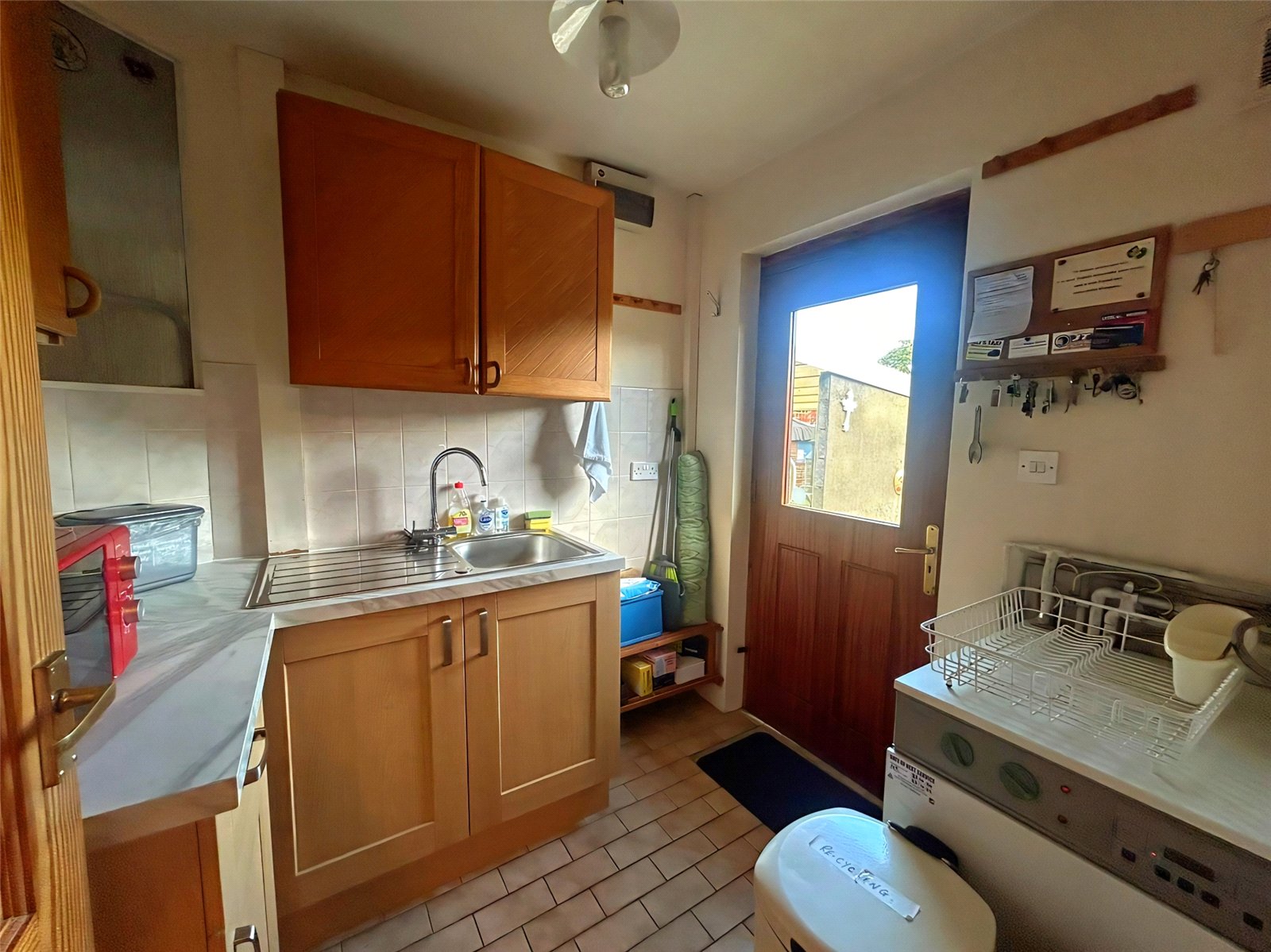 A convenient and practical utility room, perfect for managing household tasks. It includes a sink, countertop, and space for a washing machine, with a back door providing easy access to the outside.