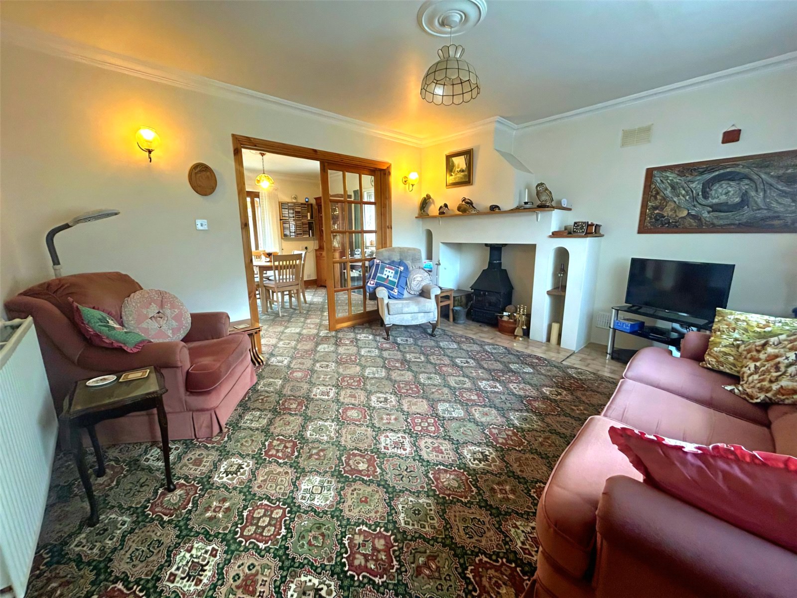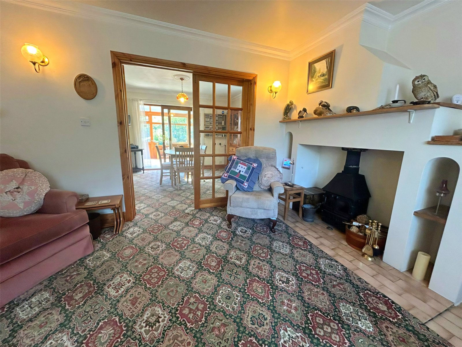 A cosy and inviting living room, perfect for relaxing. The room features a **charming fireplace with a multi-fuel burner creating a focal point and a warm atmosphere. Natural light fills the space, and **sliding doors** provide an effortless connection to the dining area, making it ideal for entertaining.