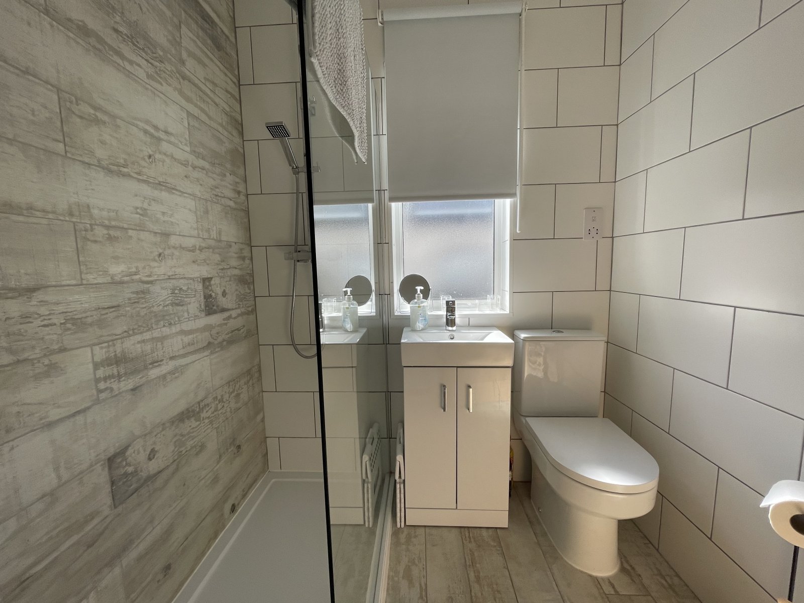 Obscured double glazed UPVC wind0w, waterfall shower with glass screen, WC, white vanity unit with storage underneath, fully tiled walls, heated towel rail.