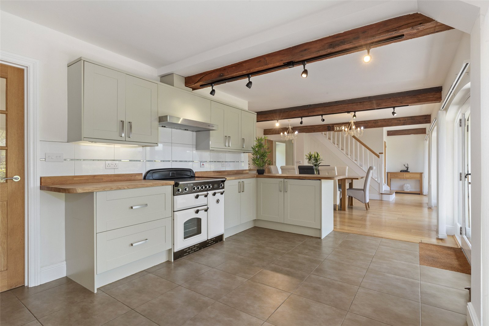 Step into the heart of this stunning home, where an exceptionally designed kitchen offers the perfect fusion of modern convenience and timeless charm. The space is anchored by a beautiful range cooker, a focal point that will delight any keen cook.