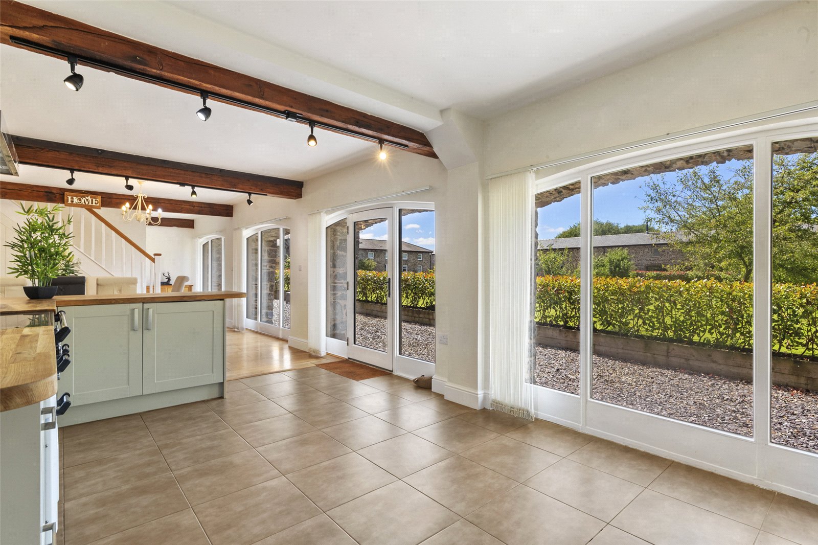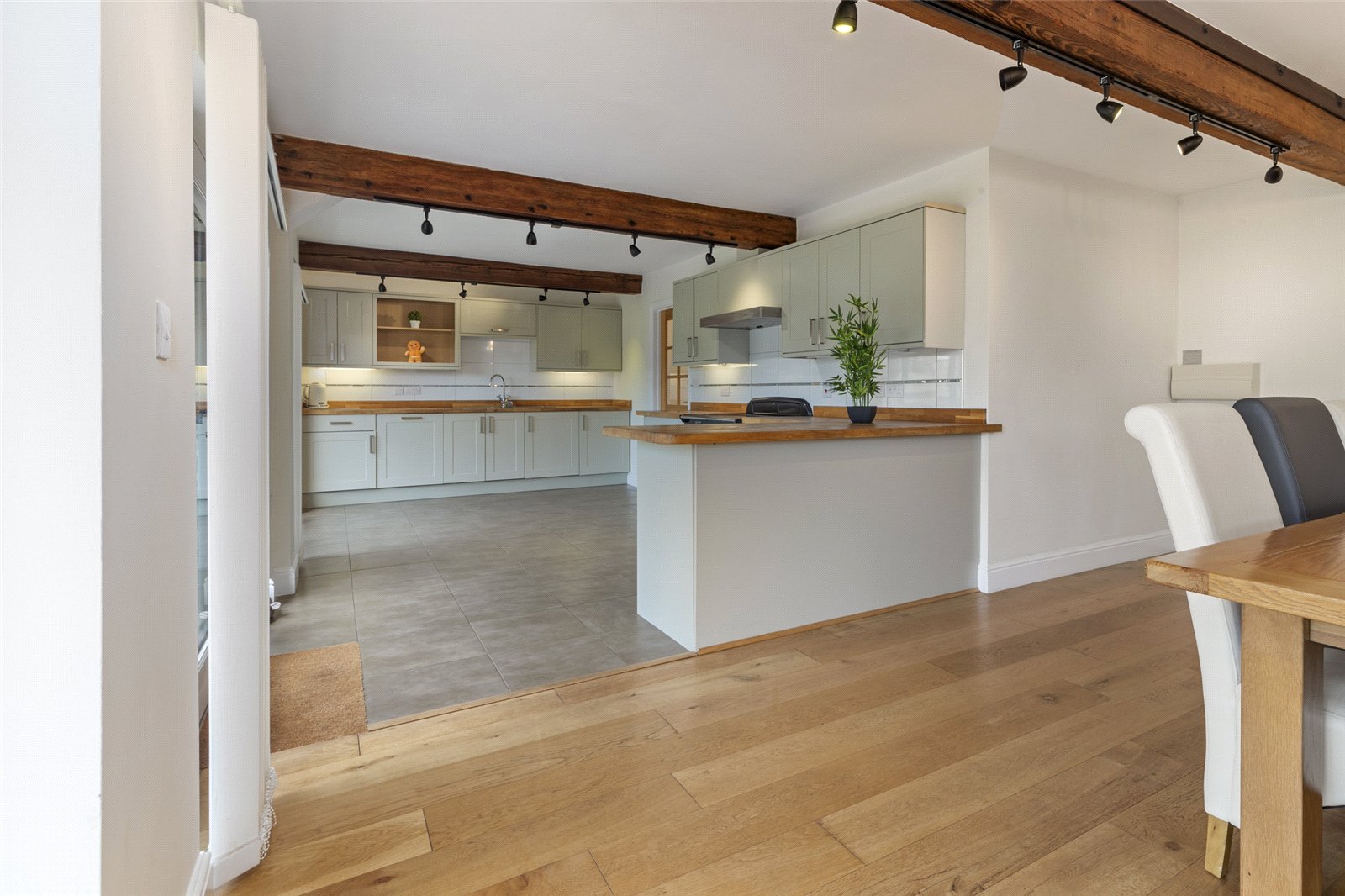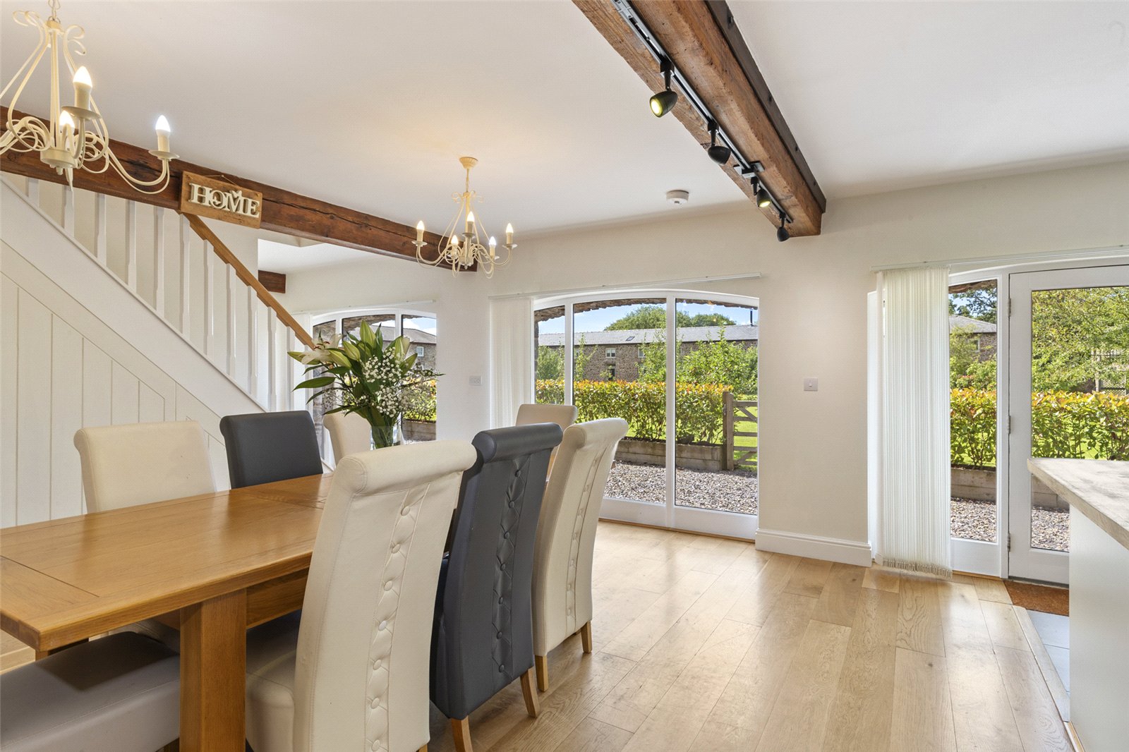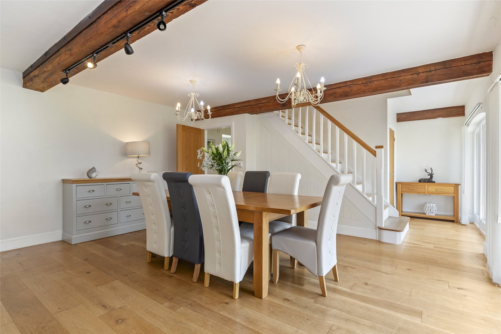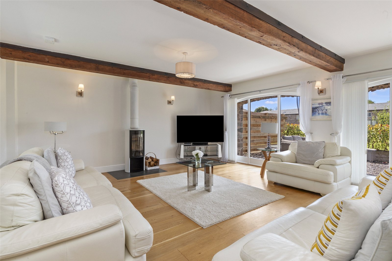 Character is provided by the beautiful exposed timber beams, which add a rustic and warm feel, while large glass French doors and expansive windows flood the room with natural light. The solid wood flooring enhances the sense of space and provides a stylish, durable finish.