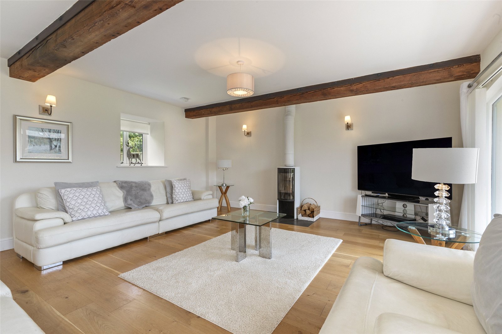 The focal point of the room is a stylish, contemporary log-burning stove, set against a clean white wall and providing a cosy and inviting atmosphere. Exposed wooden beams overhead add a touch of authentic character and warmth, complementing the beautiful oak flooring that runs throughout.