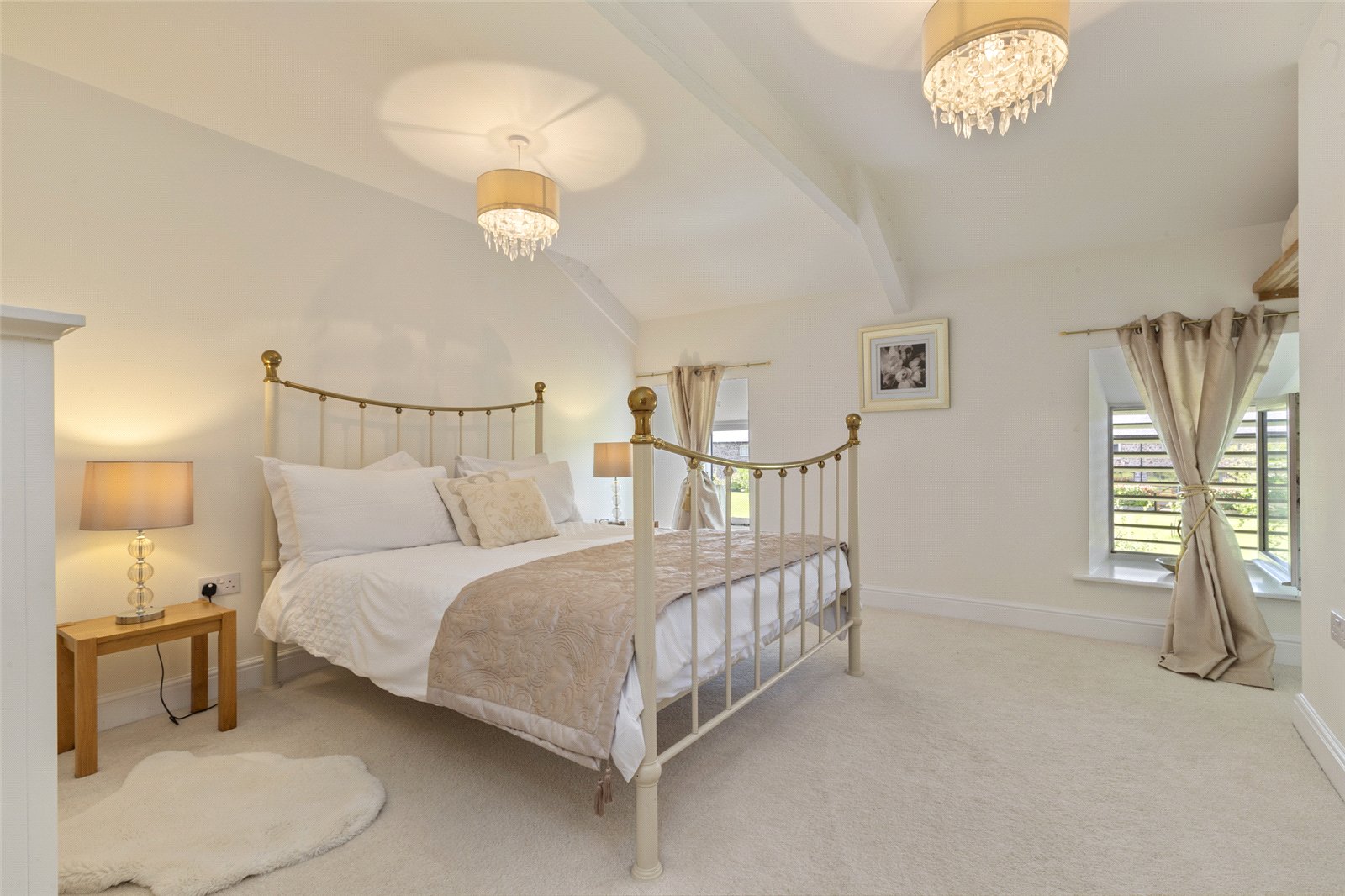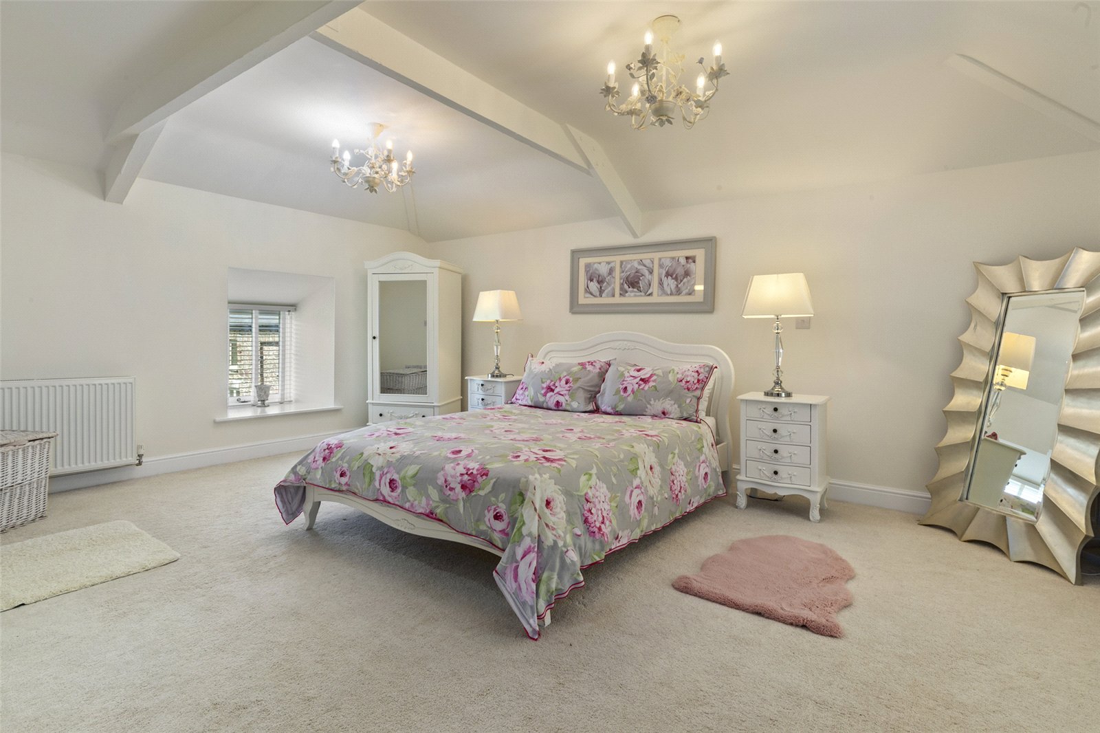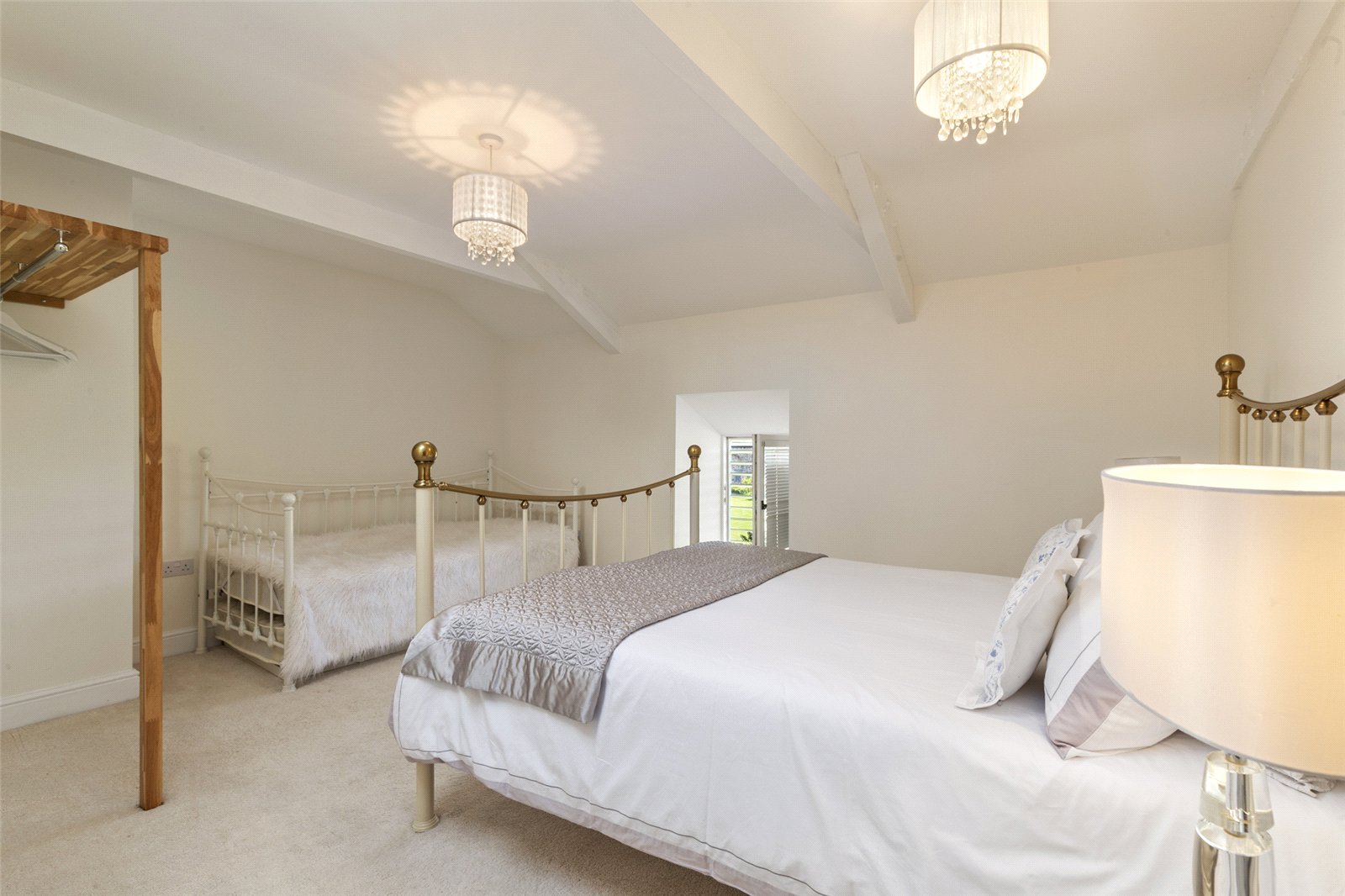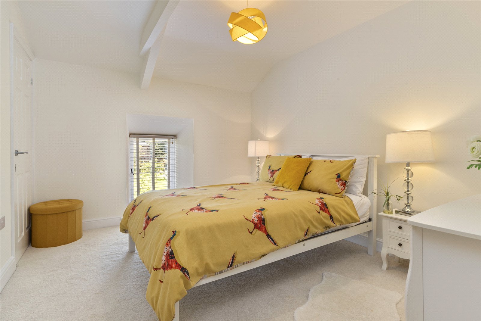 A charming and characterful double bedroom, this room provides a peaceful and private space with a touch of elegance. The high, vaulted ceiling and exposed beams add a sense of space and rustic charm, while a deep-set window with a feature window seat provides a lovely spot to sit and admire the views.