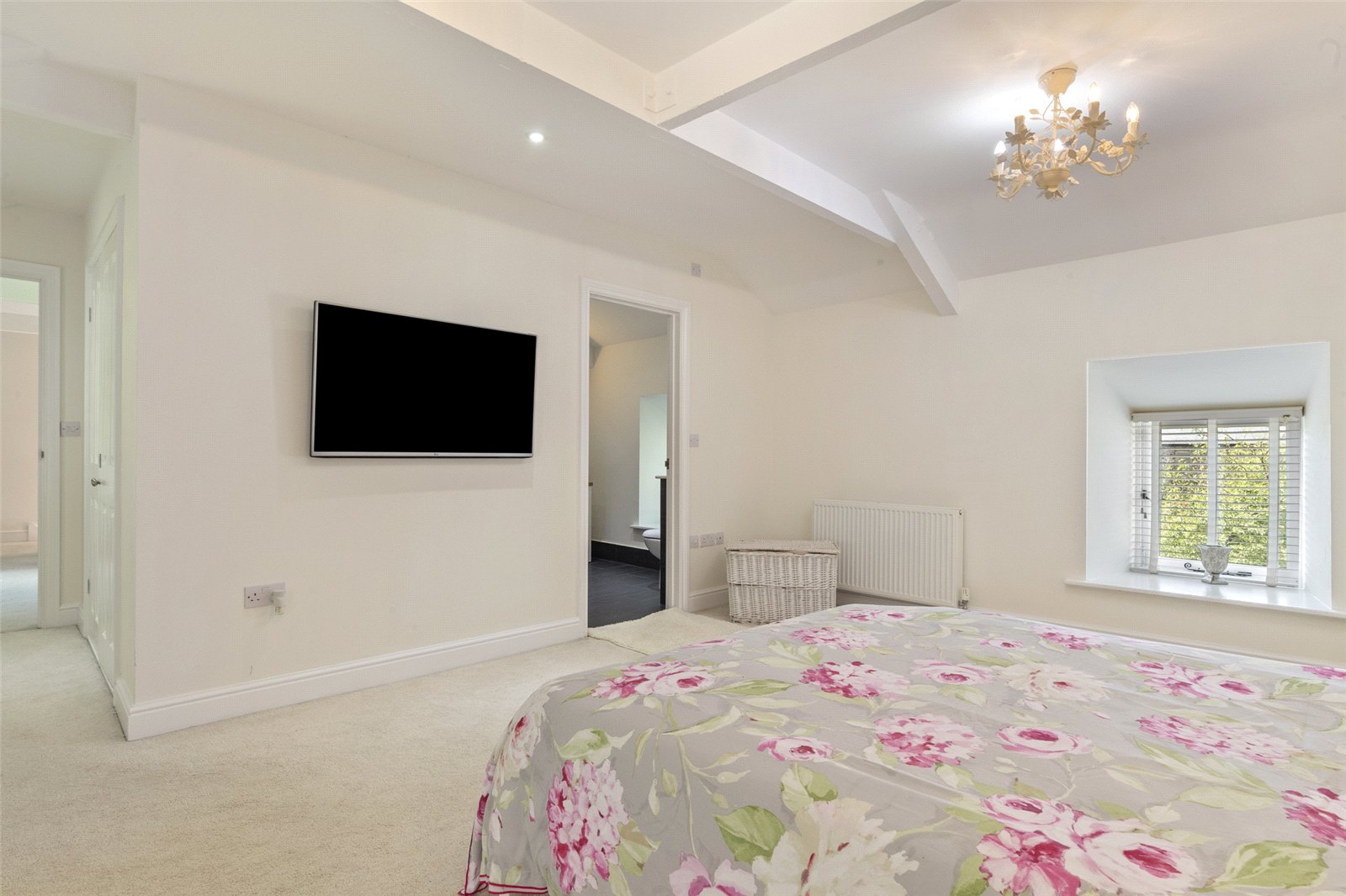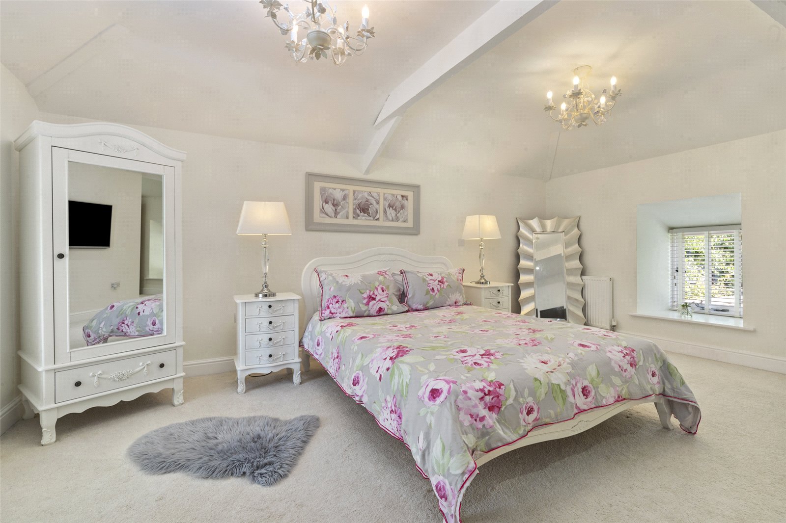 The room is bathed in natural light from a charming, deep-set window, creating a peaceful and airy atmosphere. The soft, neutral decor and plush, carpeted floor provide a soothing backdrop, while elegant chandeliers add a touch of sophisticated glamour. There is ample space for a king-sized bed and additional furnishings, with a wall-mounted television for modern convenience.