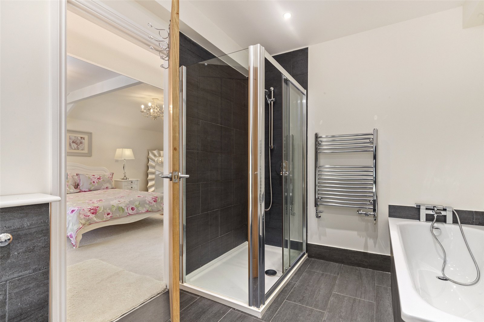 Further benefits include a chrome heated towel rail, ensuring towels are warm and dry, and recessed spotlights for a bright and clean feel. The design is both practical and luxurious, providing a perfect complement to the tranquil main bedroom.
