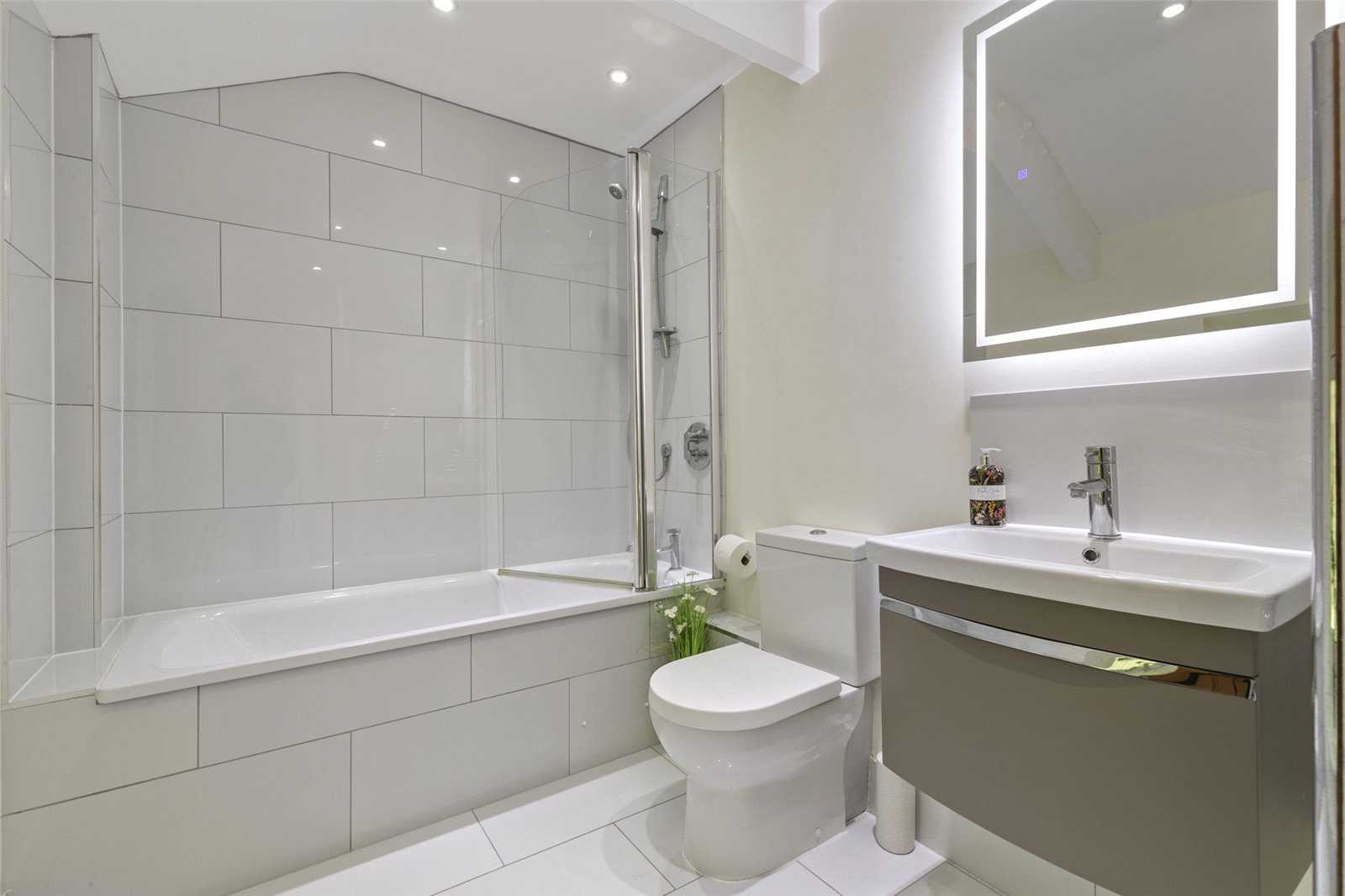 The suite includes a bath with an overhead shower and a glass screen, offering the best of both worlds. A sleek hand basin is set within a modern vanity unit, providing useful storage, and is complemented by a large, illuminated mirror above. The WC is neatly positioned next to the basin.
