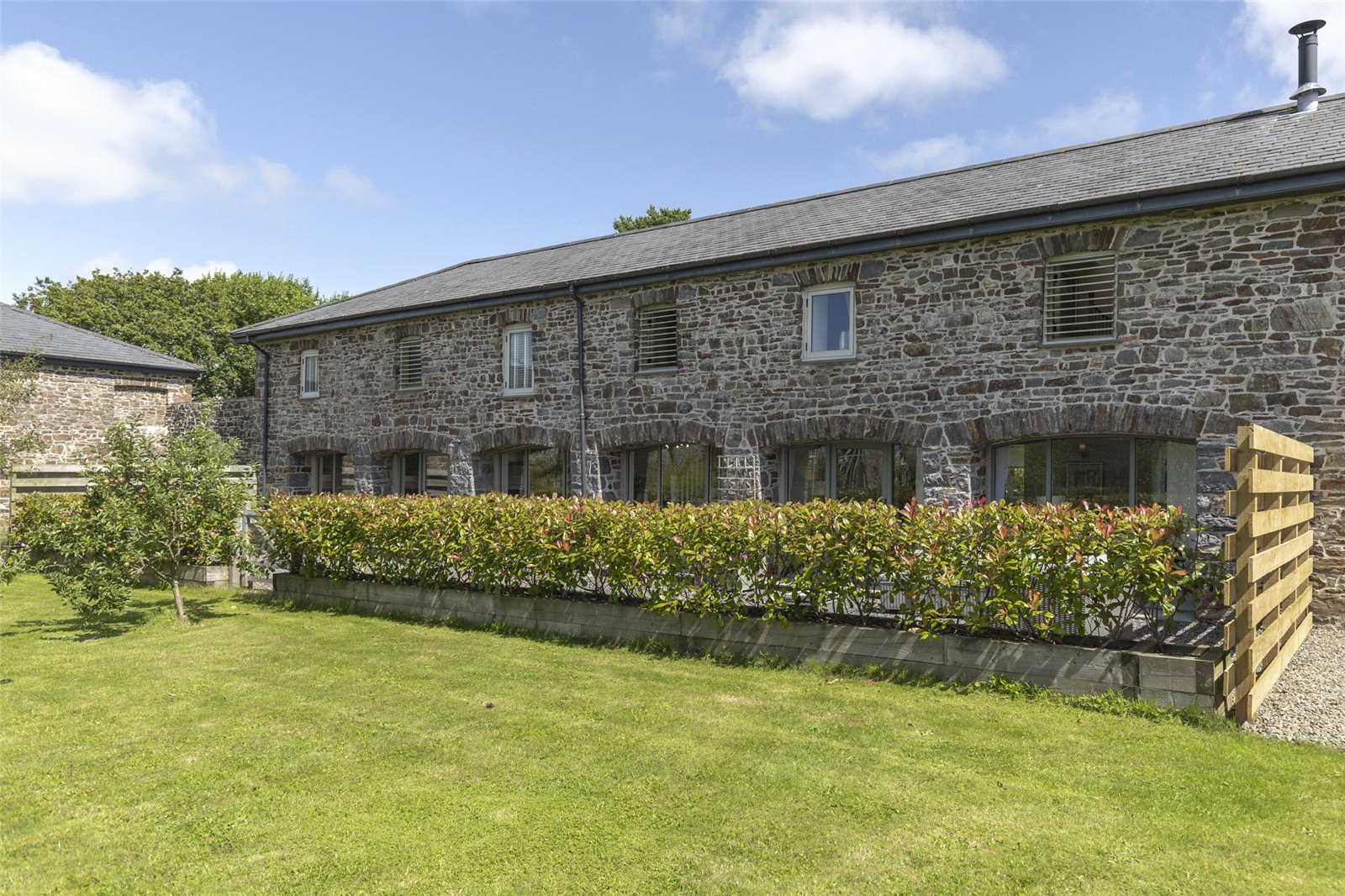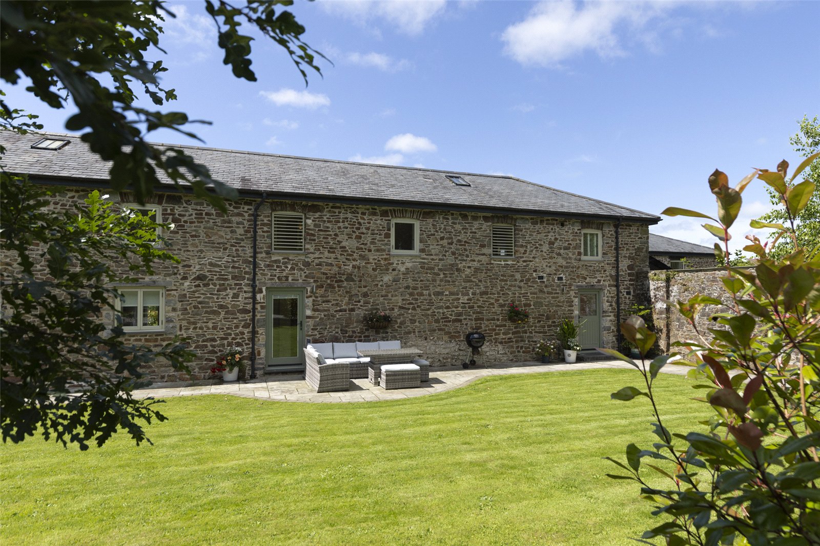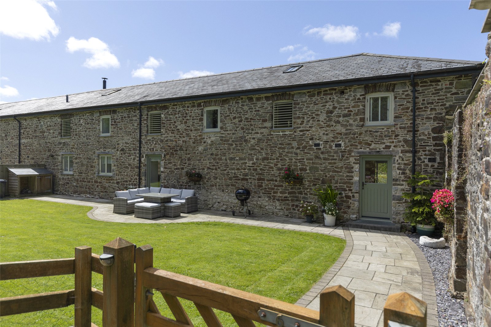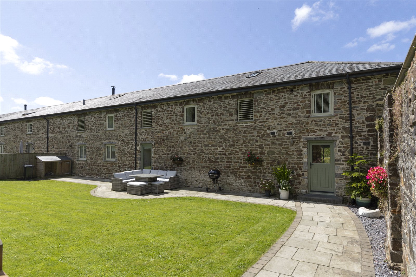 This stunning barn conversion is set within a picturesque and tranquil rural setting, forming part of a charming development of similar properties. The exterior boasts beautiful, traditional stone construction with a slate roof, perfectly blending into its countryside surroundings.