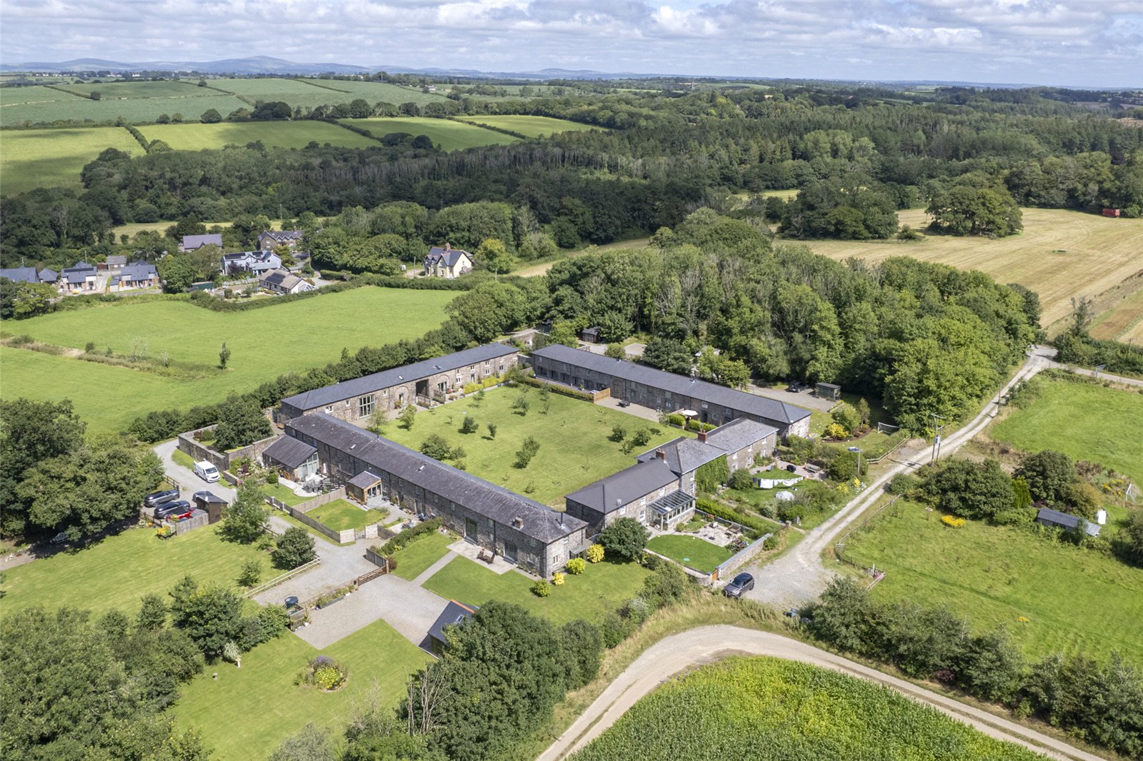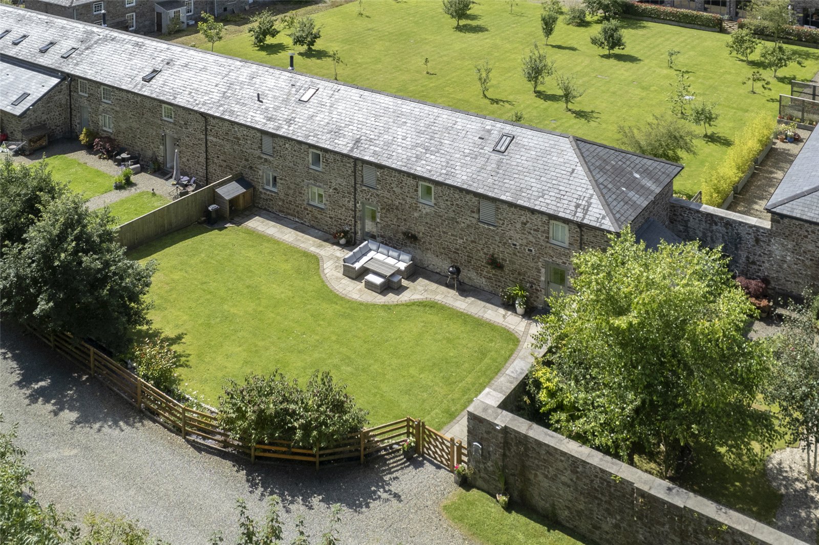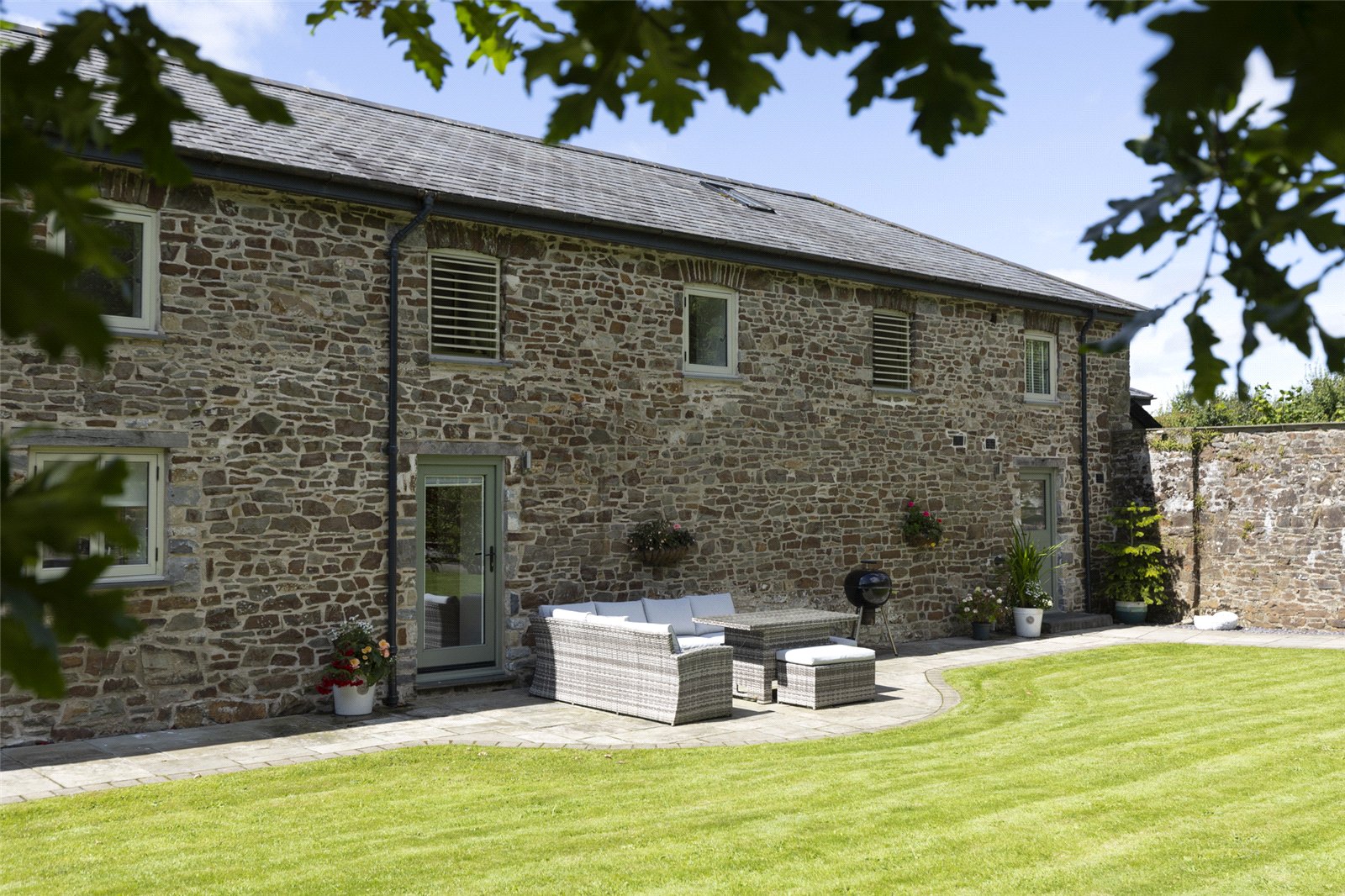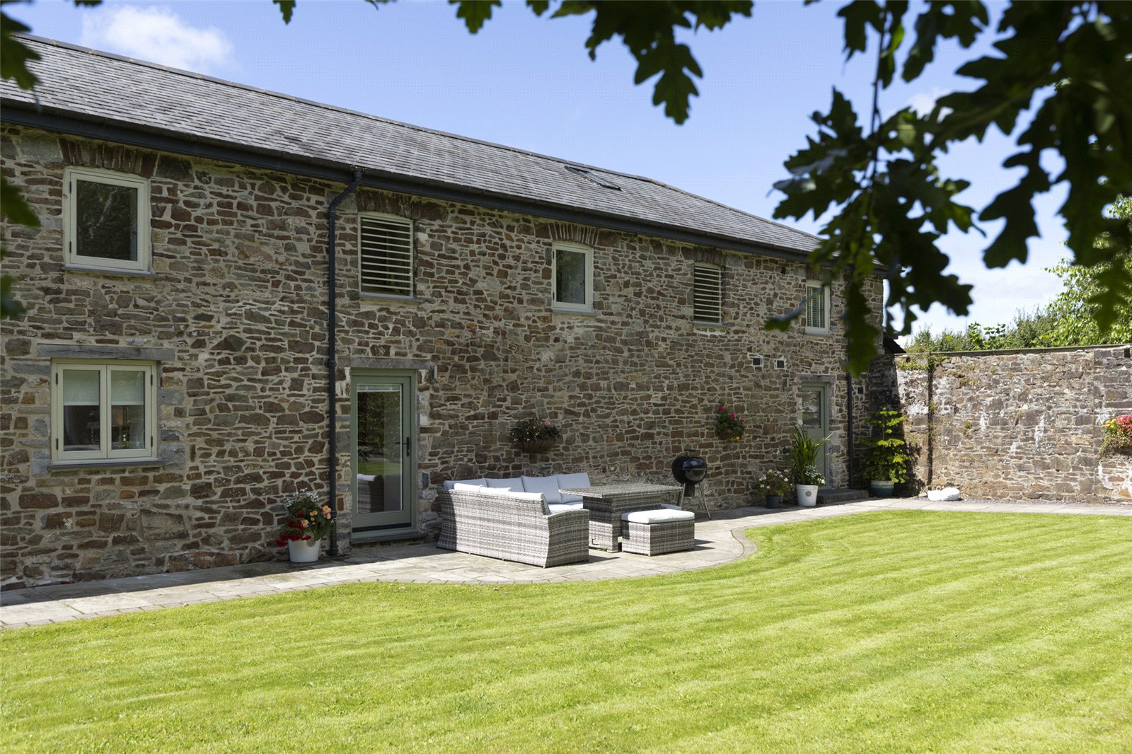 This stunning barn conversion is set within a picturesque and tranquil rural setting, forming part of a charming development of similar properties. The exterior boasts beautiful, traditional stone construction with a slate roof, perfectly blending into its countryside surroundings.