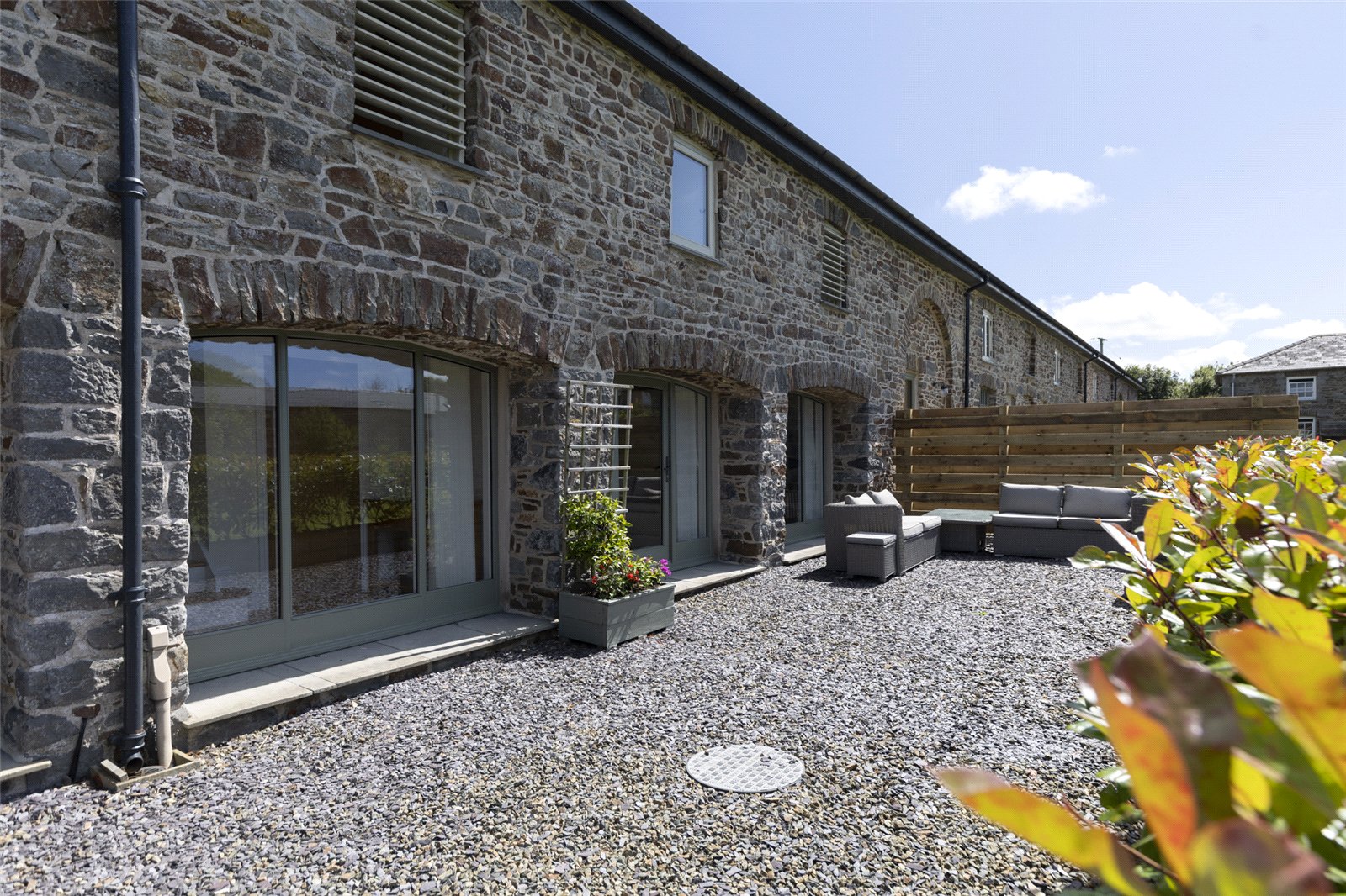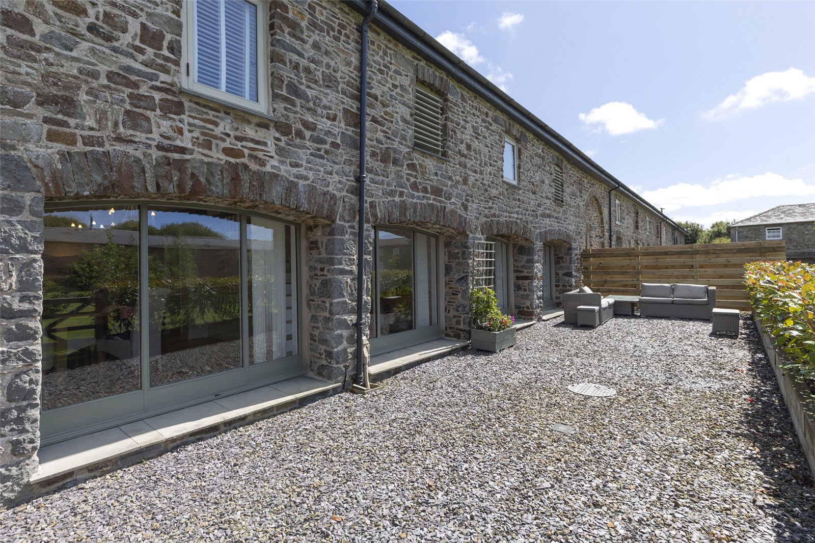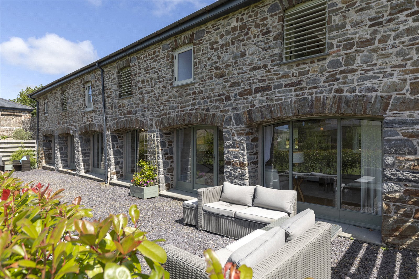 Step into the heart of this stunning barn conversion, where the spacious living room seamlessly blends rustic charm with contemporary elegance. The room is bathed in natural light, pouring in through the two sets of French doors that open out onto the patio and private garden, creating a perfect connection with the outdoors.