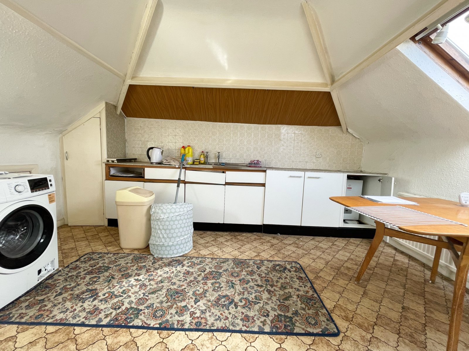 The property's second kitchen; comprising briefly of base kitchen units with integrated stainless steel sink, laminate flooring, half-tiled walls, ceiling light, radiator, front-facing double-glazed window and rear double-glazed Velux window.