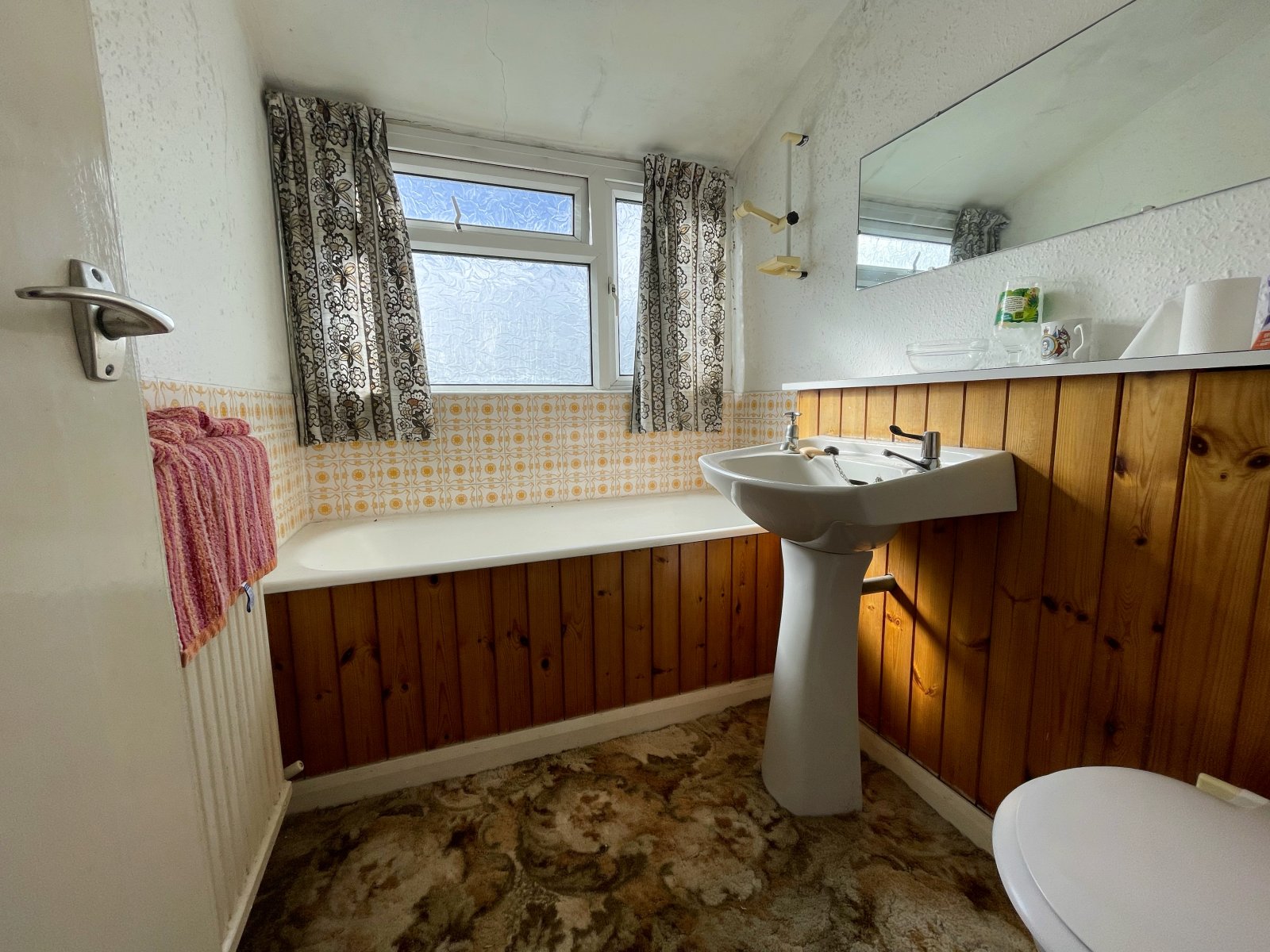 First floor bathroom, benefitting from bath, wash hand basin, w/c, carpeted flooring, half-tiled walls, ceiling light, double-glazed window to fore.