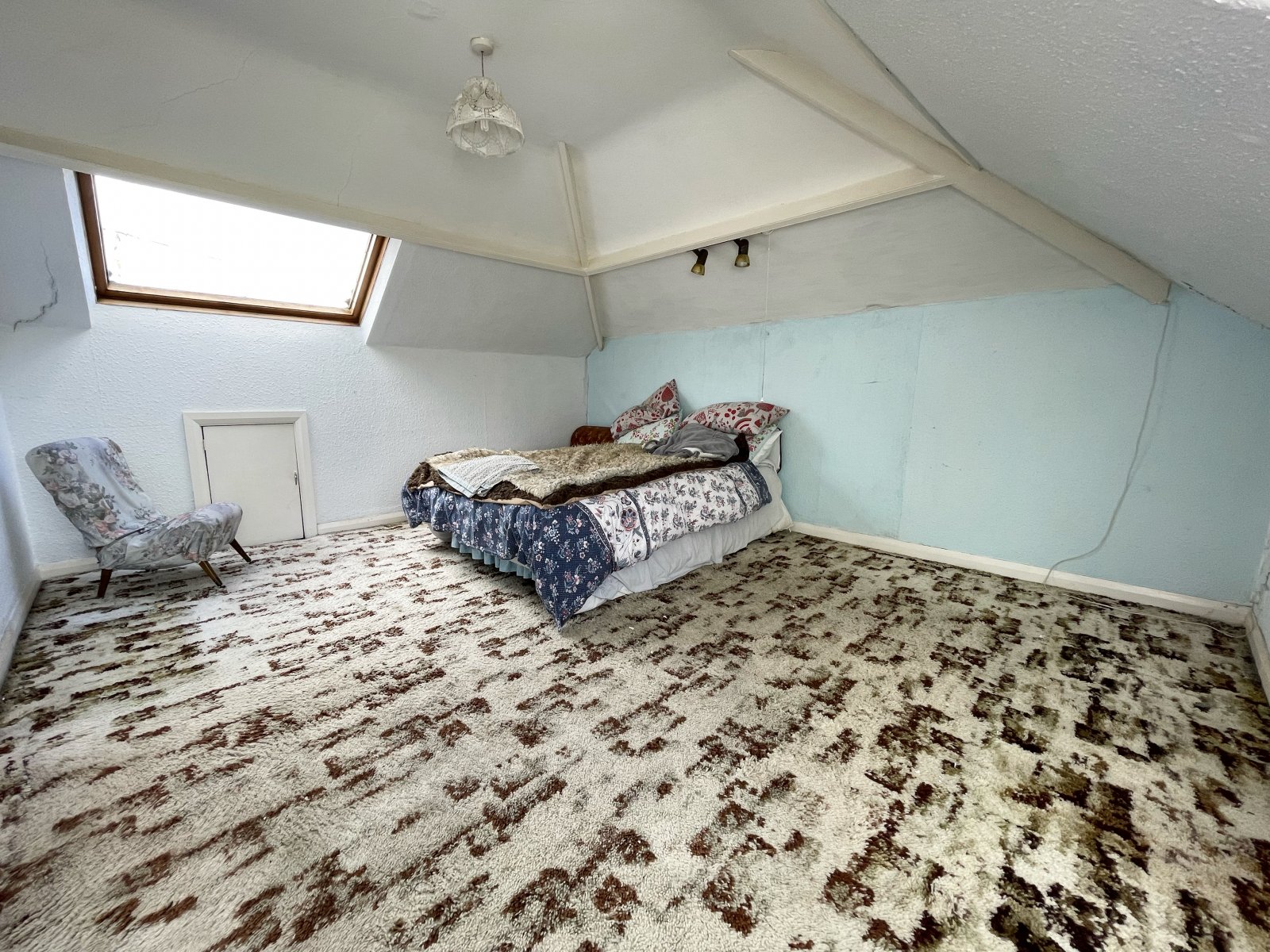 Sizeable double bedroom, with carpeted flooring, ceiling light, radiator, double-glazed Velux skylight to rear, double-glazed window to fore and eaves storage cupboards.