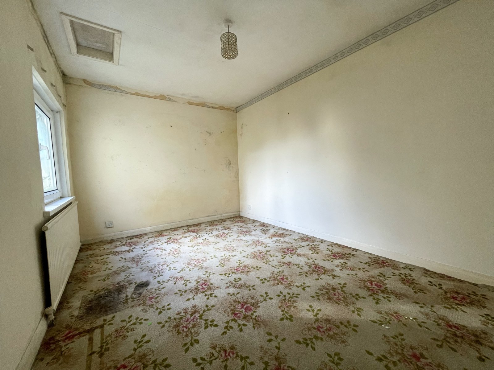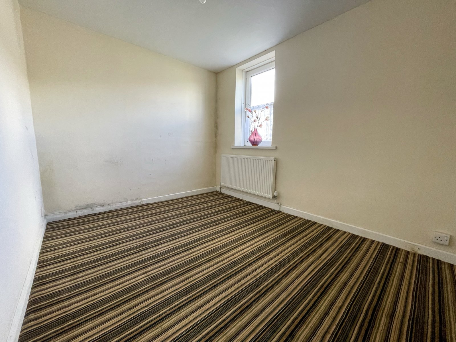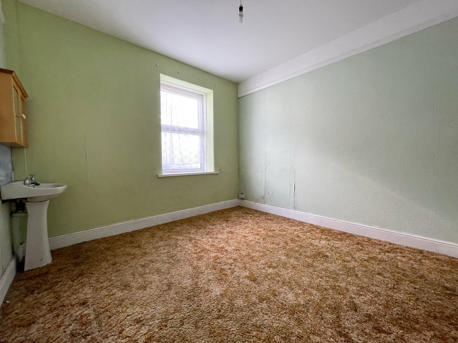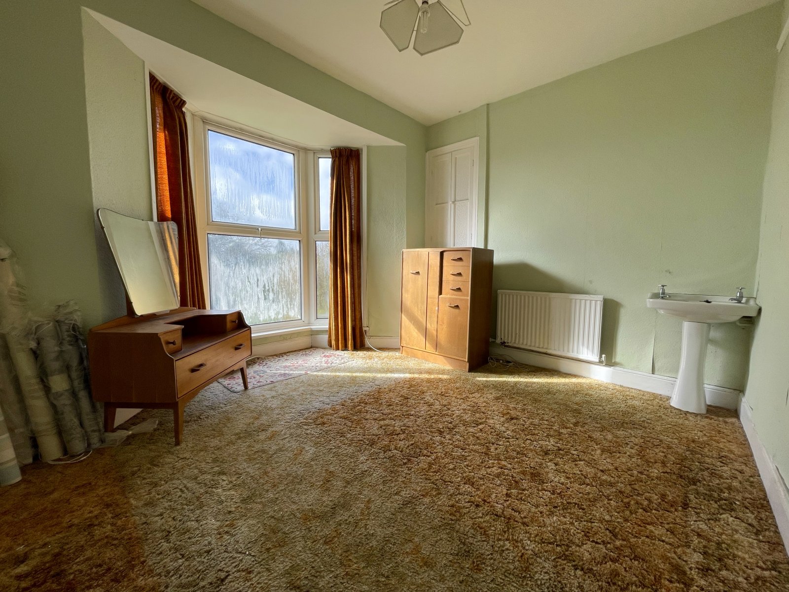 From the property's entrance hallways, access is given to this large double bedroom with carpeted flooring, ceiling light, radiator, double-glazed bay window to fore and wash hand basin.