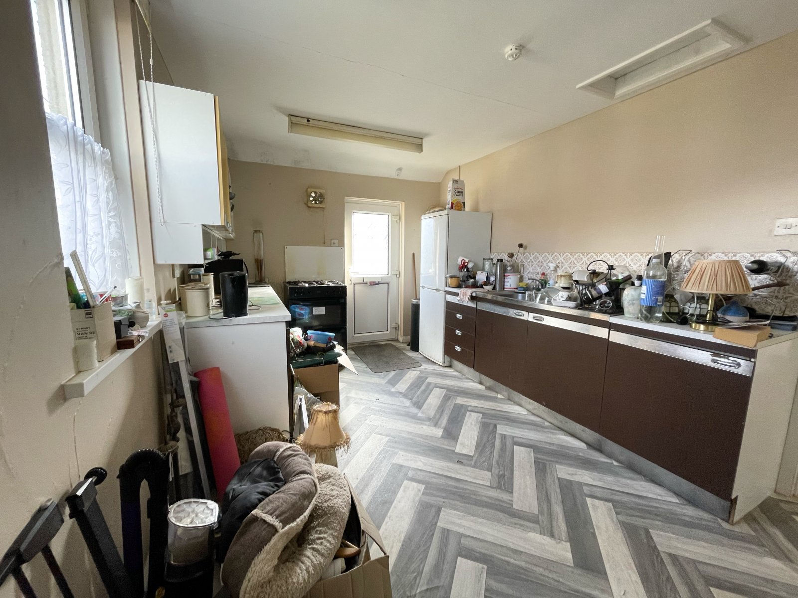 Sizeable kitchen space, benefitting from built-in kitchen units with stainless steel sink, gas cooker, laminate flooring, ceiling light, radiator, double-glazed window to rear and external access door. Access to;