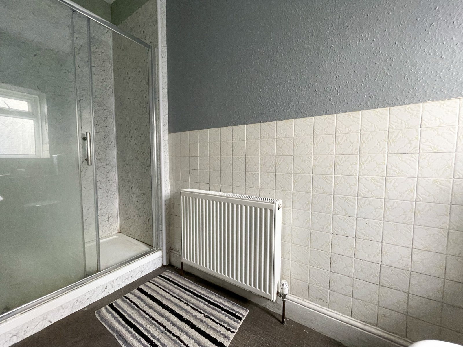 Ground floor shower room, comprising of laminate flooring, ceiling light, radiator, double-glazed window to side, shower unit, w/c and wash hand basin.