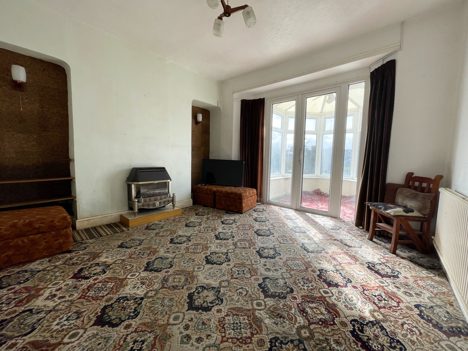 Light and airy lounge, benefitting from carpeted flooring, ceiling light, radiator, gas fireplace, alcove shelving, double-glazed French doors leading into glass conservatory.