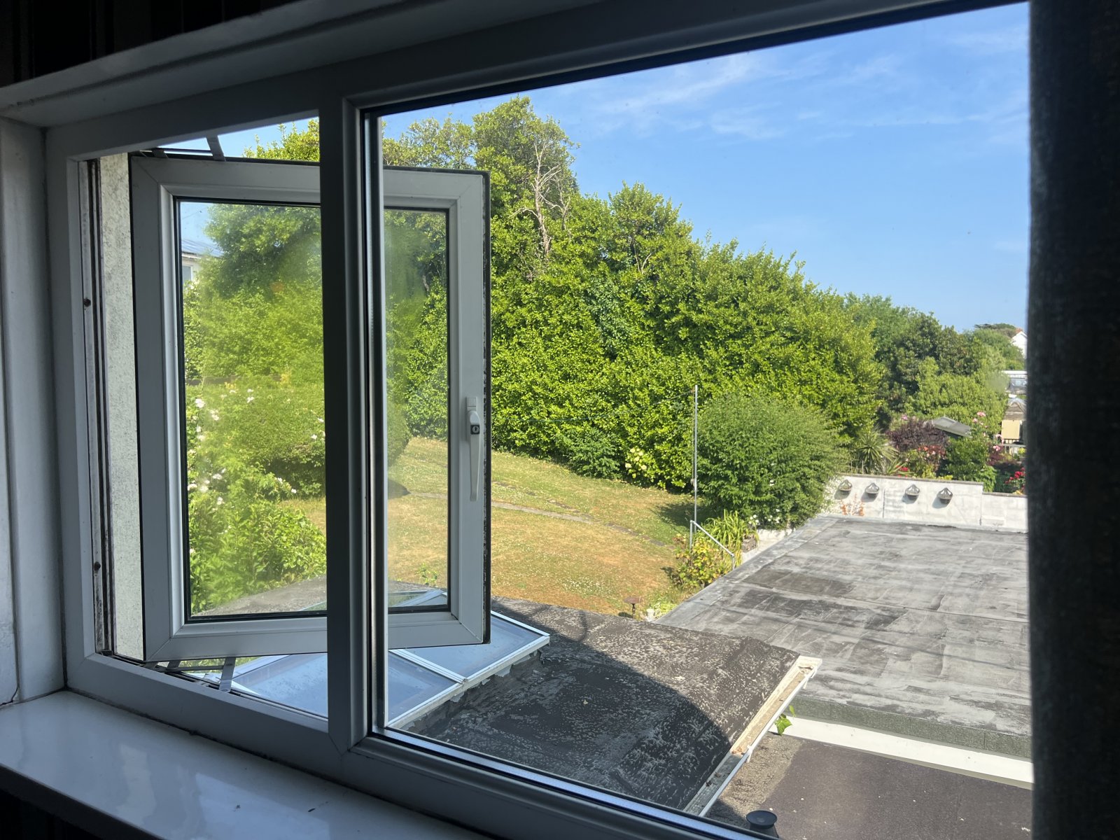 Wall mounted radiator, central ceiling light, laminated flooring and large uPVC double glazed window