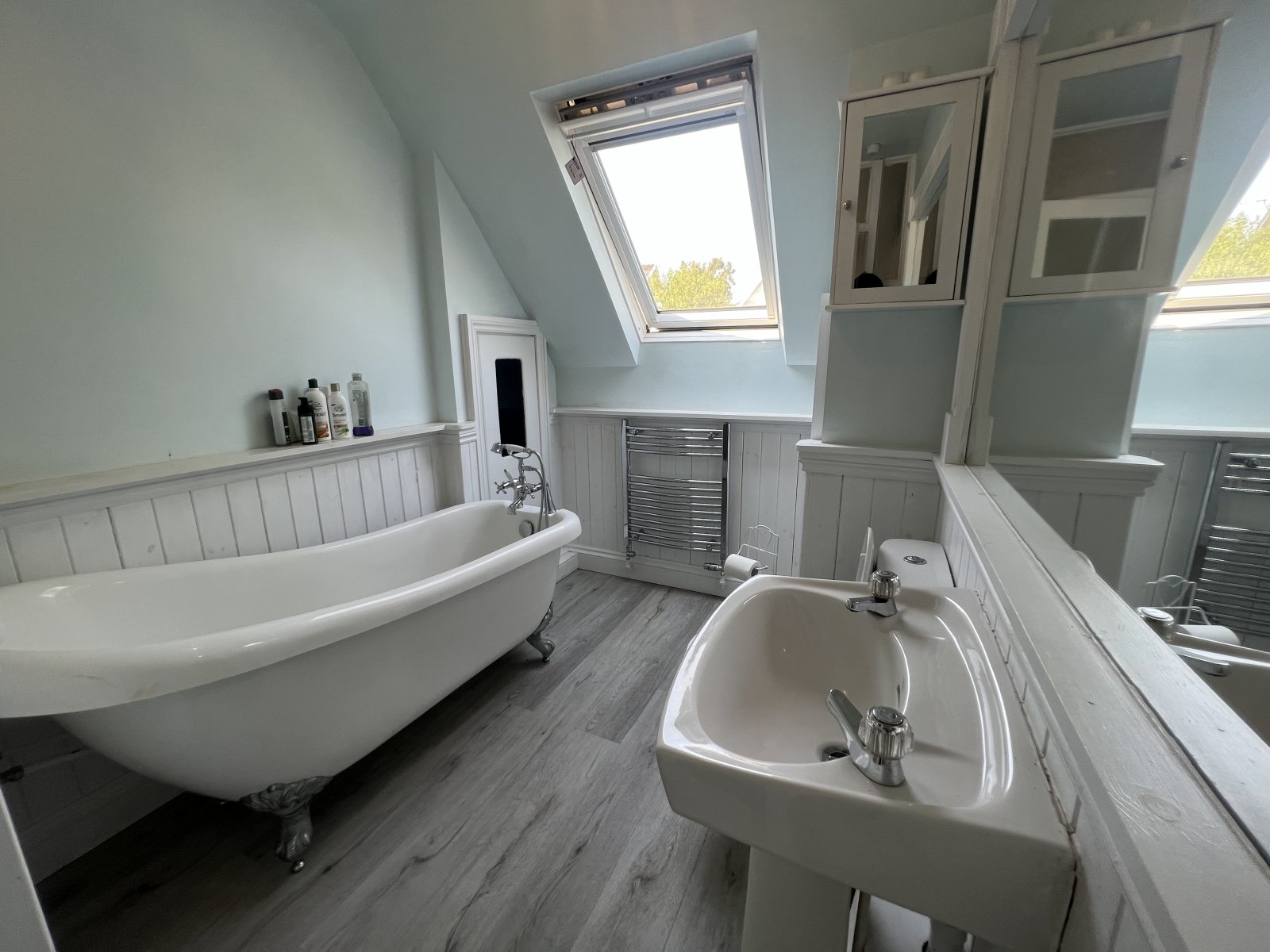 Laminated flooring, dual tap hand wash basin, toilet, bath, 2 x storage cupboard, heated towel rail, sky light, central ceiling light, loft access