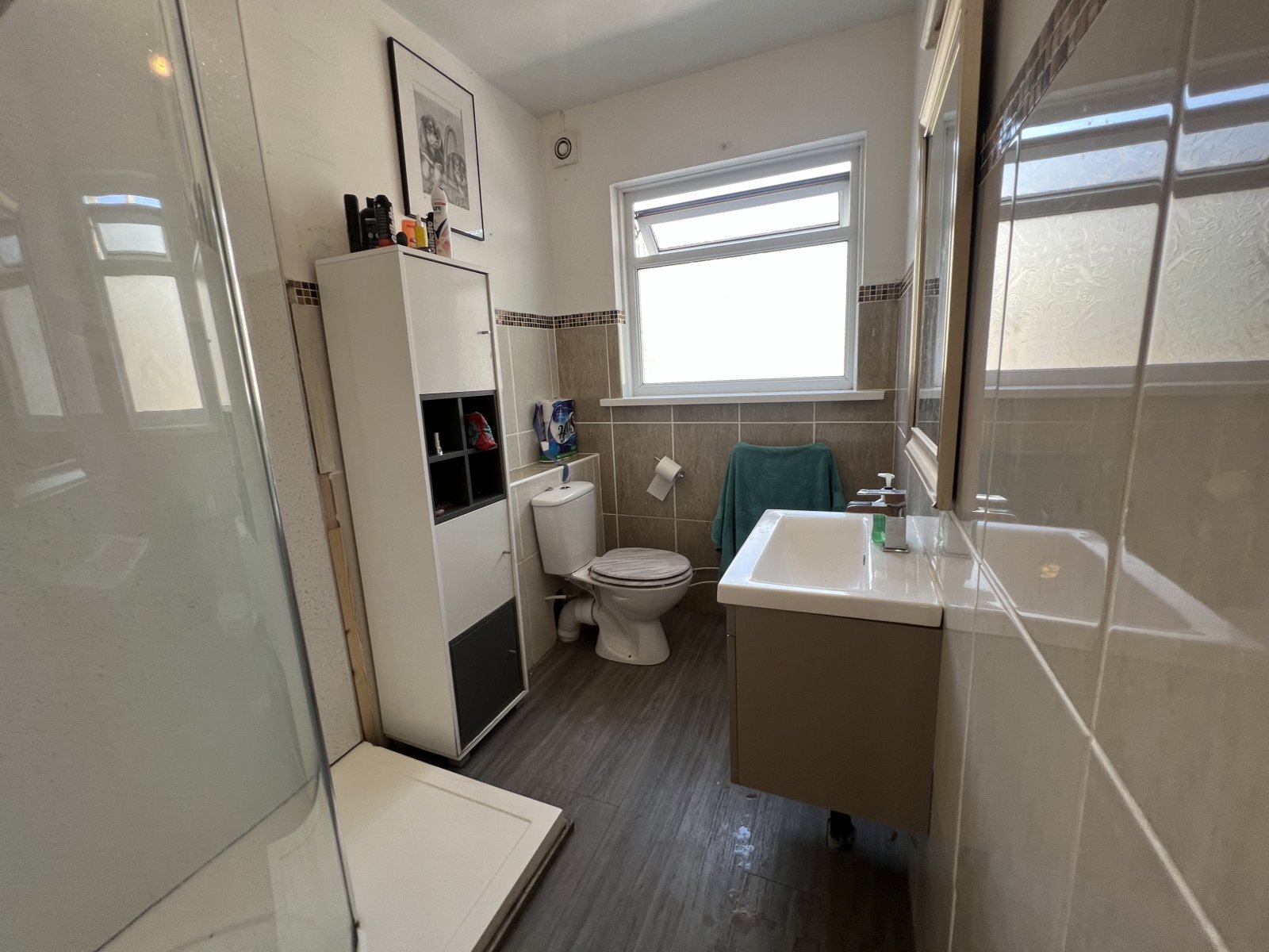 Toilet, mixer tap wash hand basin, obscured uPVC double glazed window, walk in shower, central ceiling light, laminated flooring.