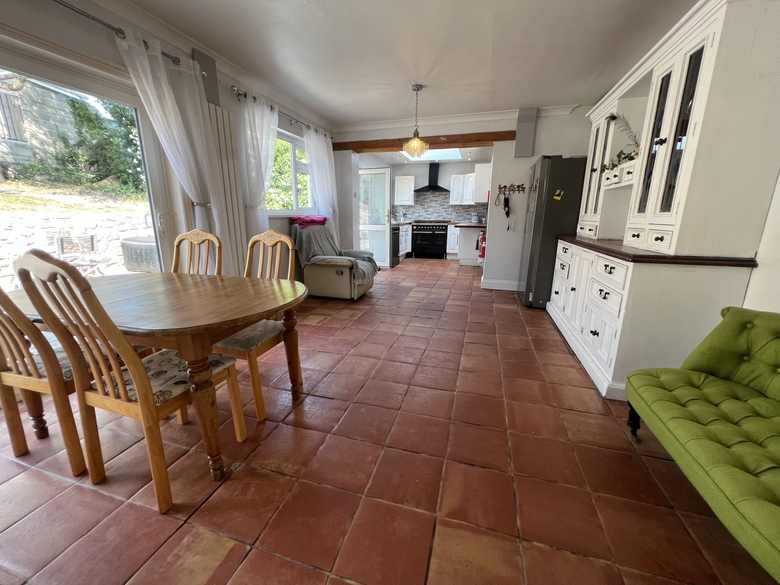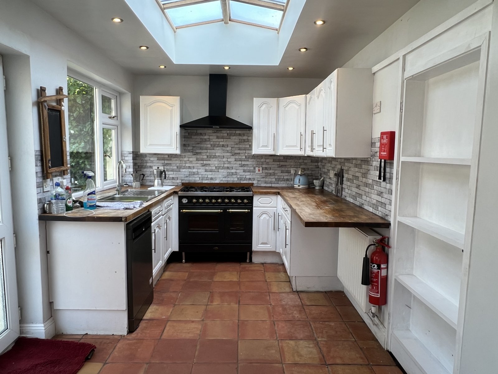 Tiled flooring, uPVC double glazed patio doors, 2 x uPVC double glazed window, base and wall units, gas cooker, sky light, 2 x ceiling lights, wall mounted radiator, mixer tap sink, spot lights.