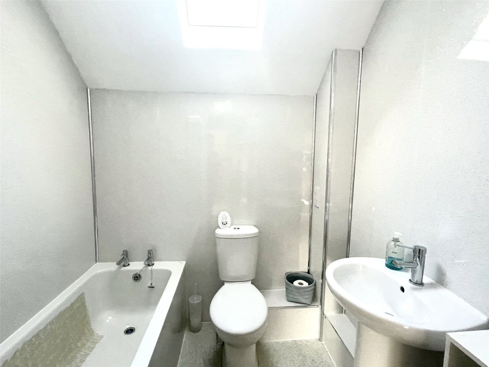 Vinyl floor, fitted bath with taps and electric shower over, bi-fold glass shower screen. WC, wash hand basin with mixer taps, Velux window, ceiling light, uPVC panelled walls.