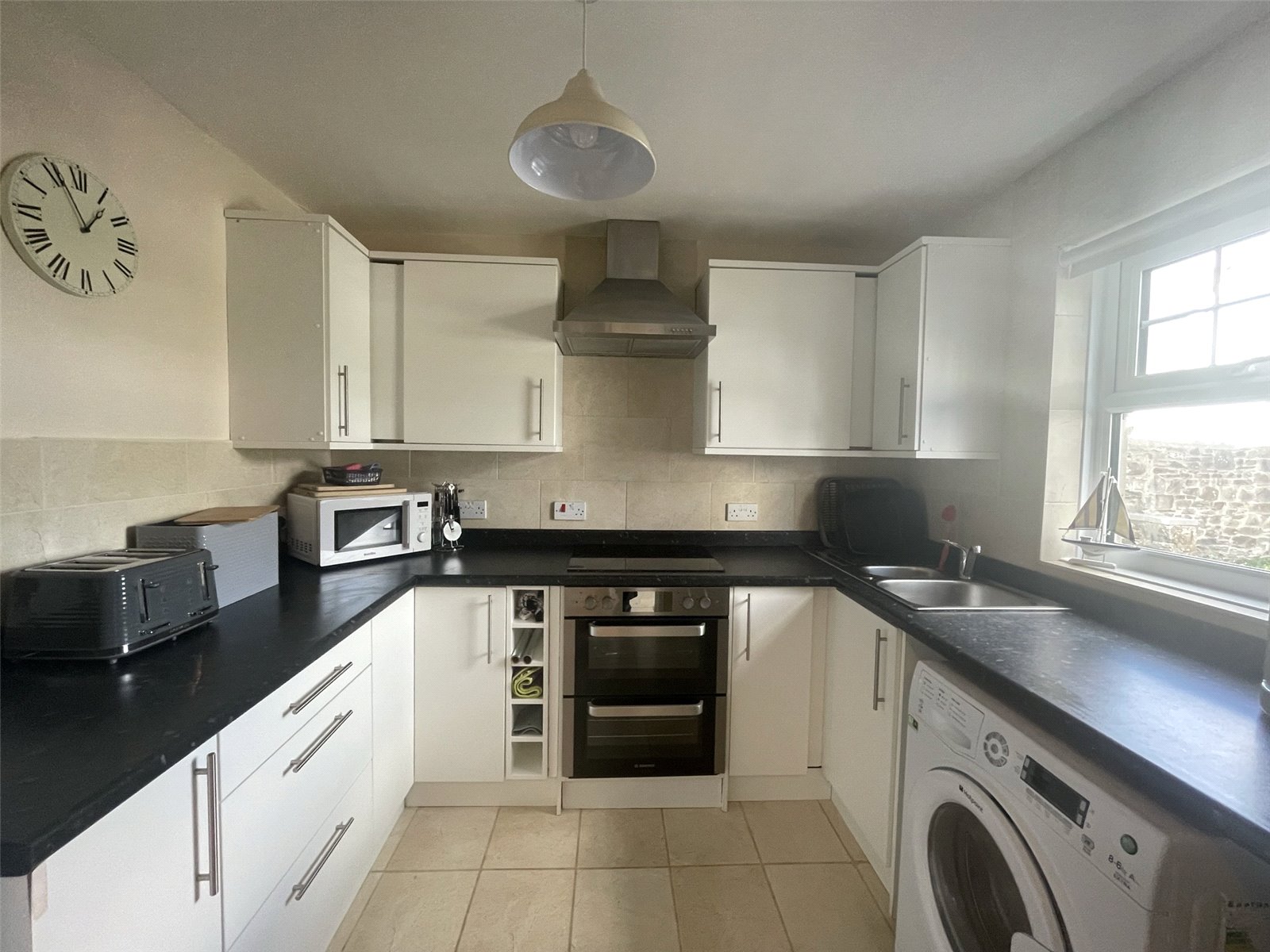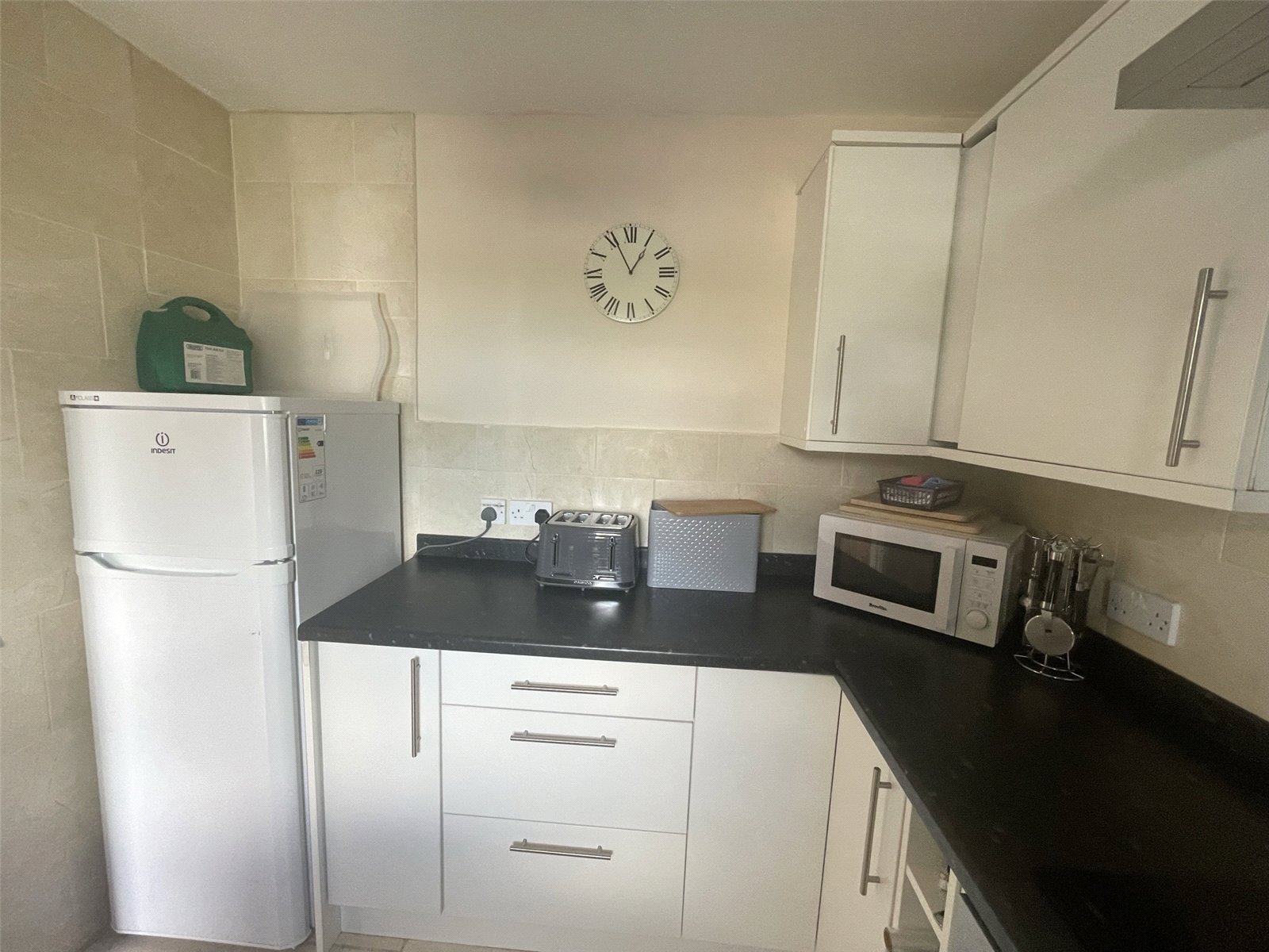 Tiled flooring, range of base and wall units with tiled splash back. Integrated cooker and electric hob, overhead extractor fan, uPVC double glazed window, space for fridge, washing machine and tumble dryer, 1.5 sink and drainer with mixer tap, ceiling light.