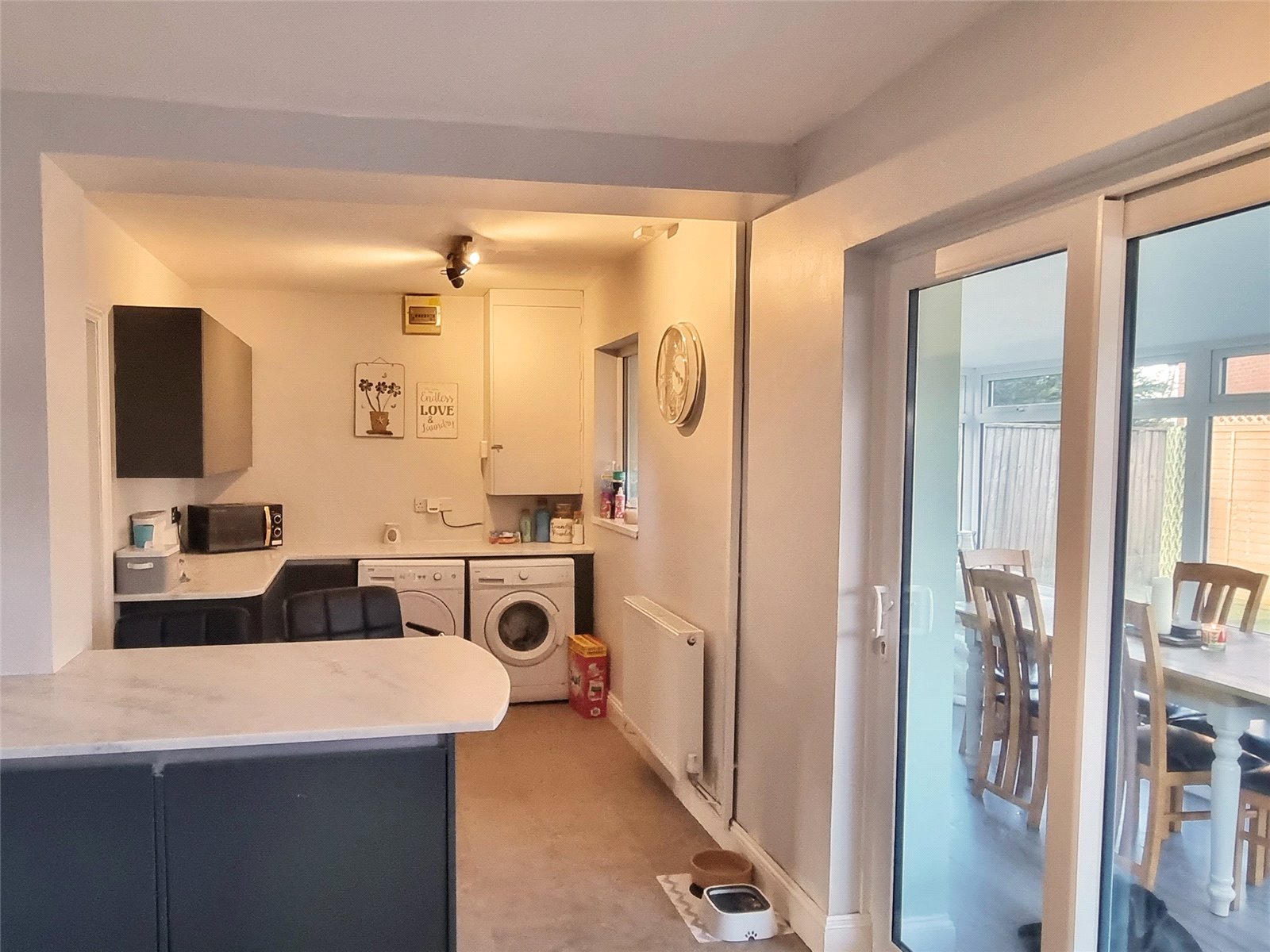 Tiled floor, range of base and wall units, intergrated fridge, freezer and dishwasher, cooker, cooker hood, inset sink with mixer tap, radiator, uPVC double glazed windows and patio door, light fitting.
