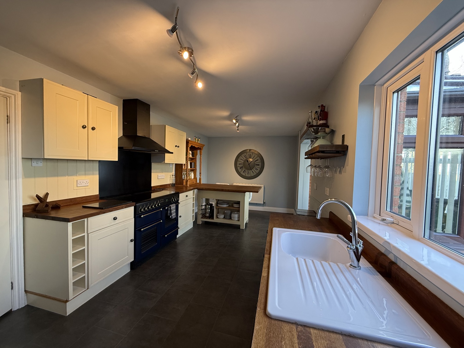 Fitted kitchen units, gas range cooker, vinyl flooring, uPVC double glazed window to the rear. Leads to;