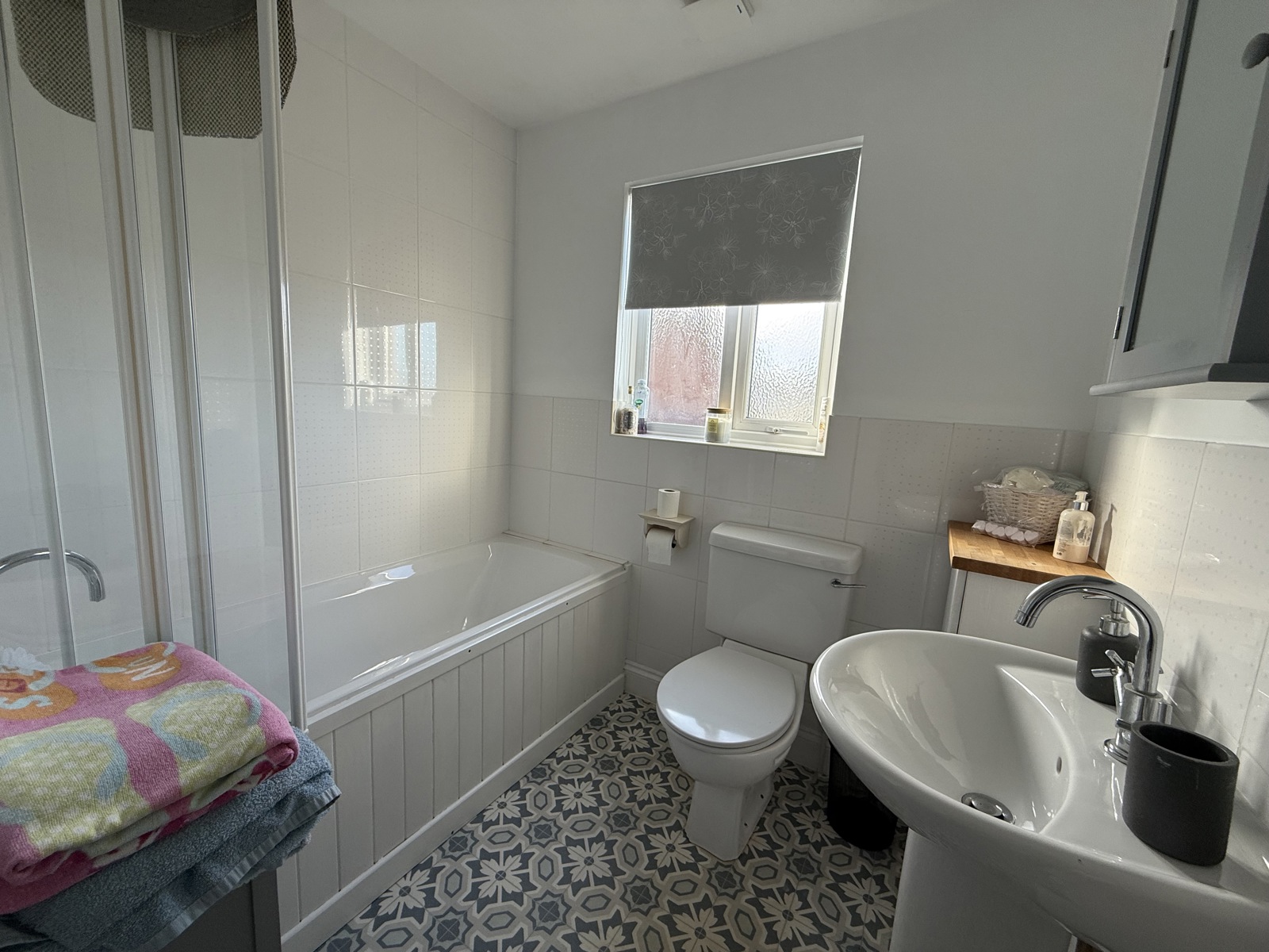 uPVC obscured double glazed window overlooking the front of the property, WC, wash hand basin and bath with a shower above, vinyl flooring.