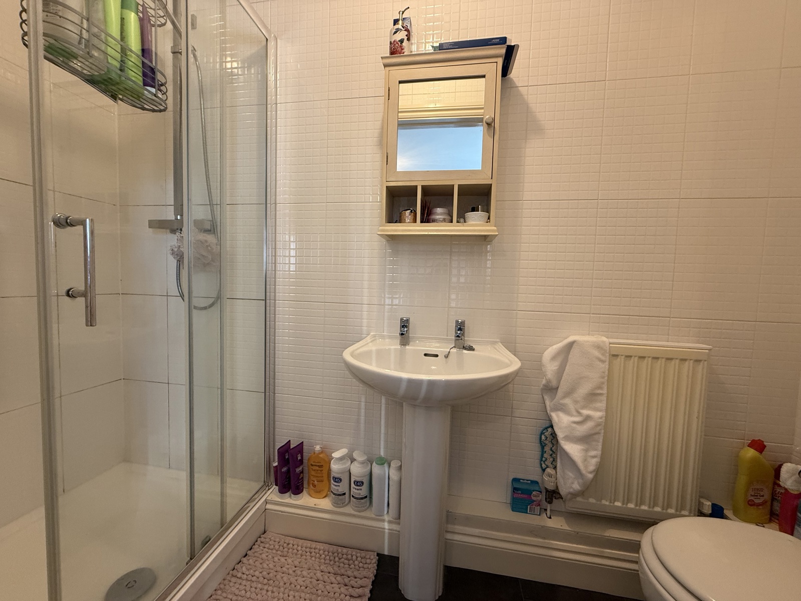 WC, wash hand basin, shower cubicle, extractor fan and vinyl flooring.