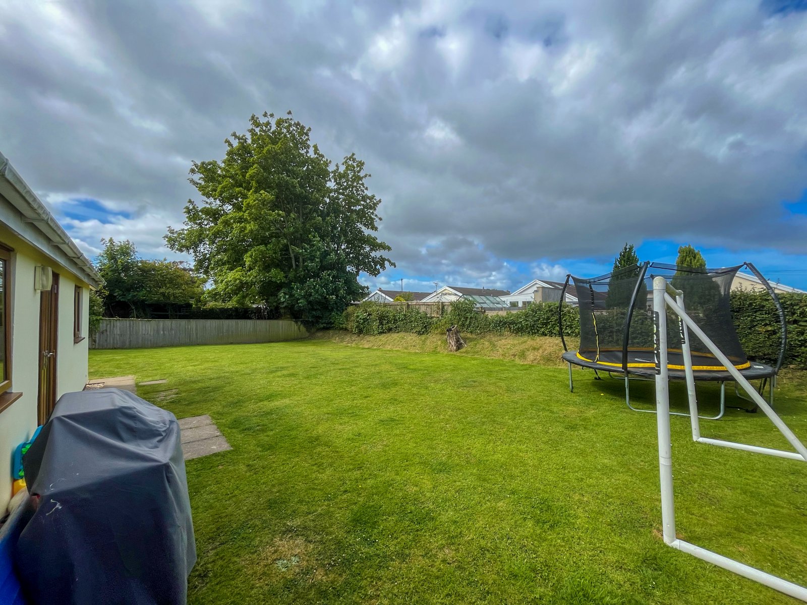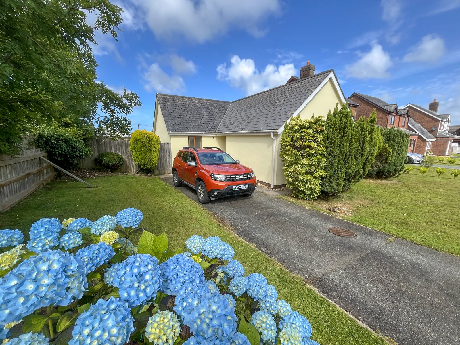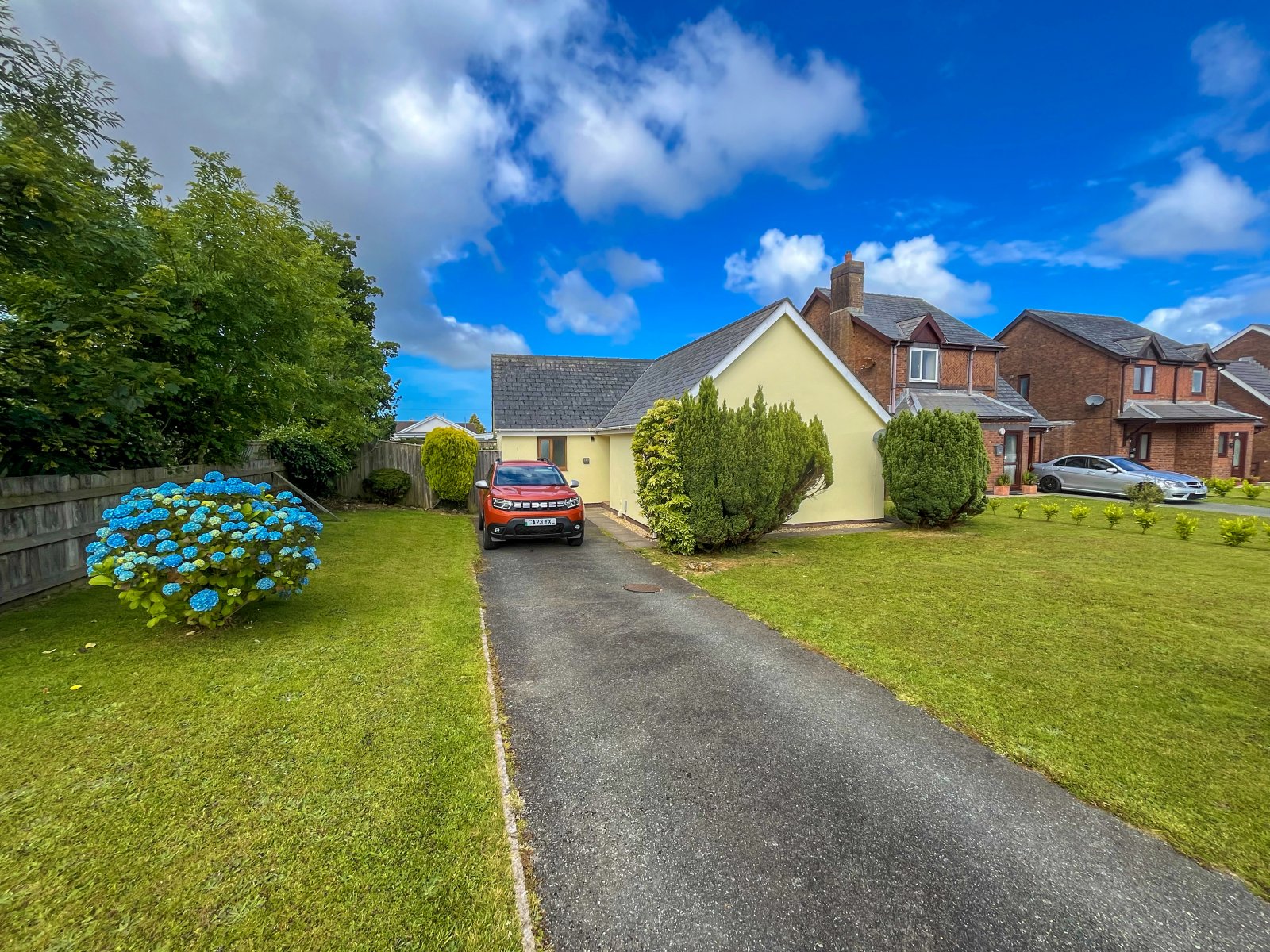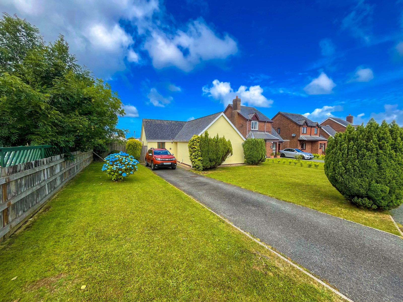 Sizeable tarmac driveway with grass lawn adjacent, access to rear garden with sizeable lawn and small patio area.
