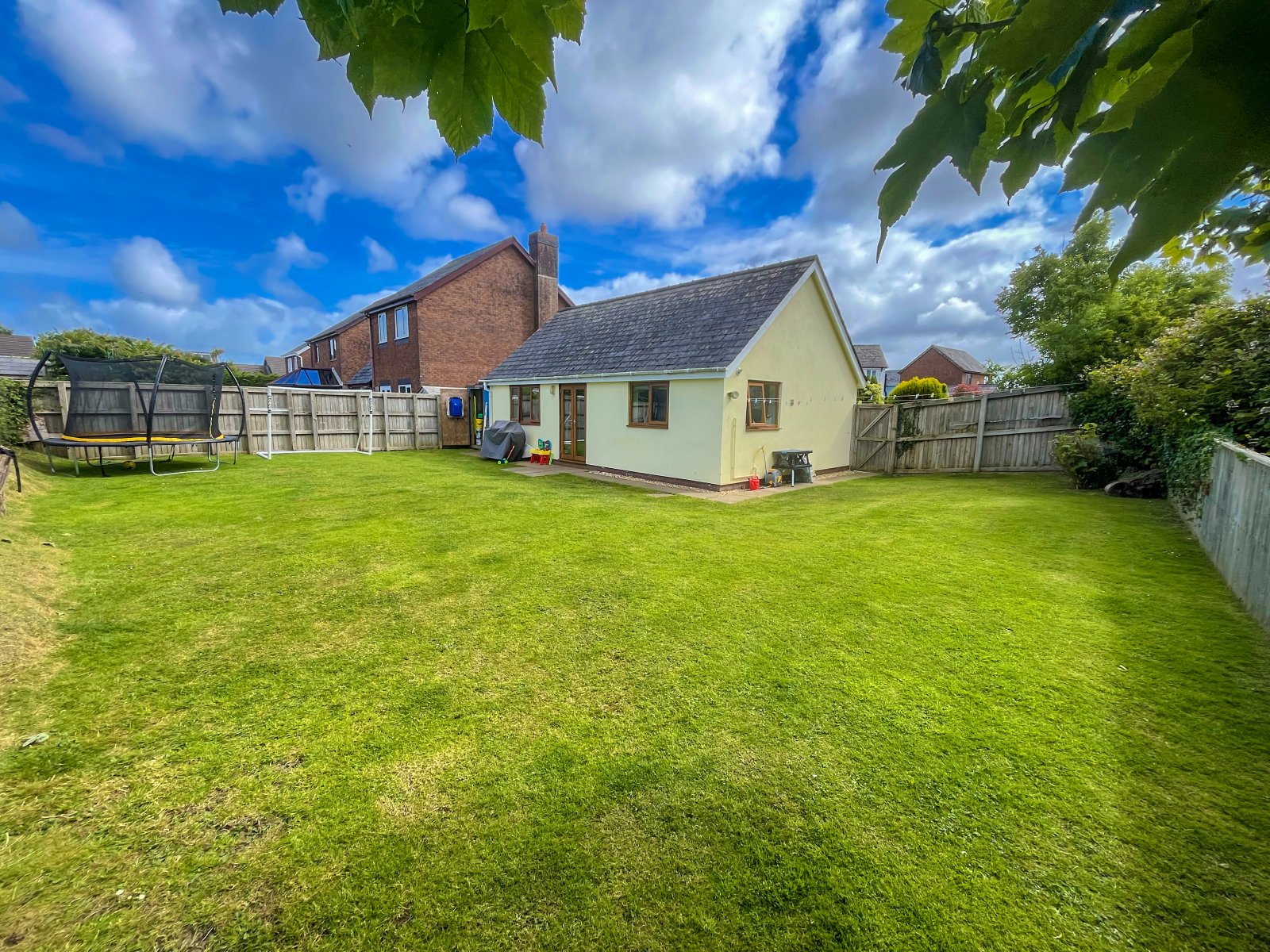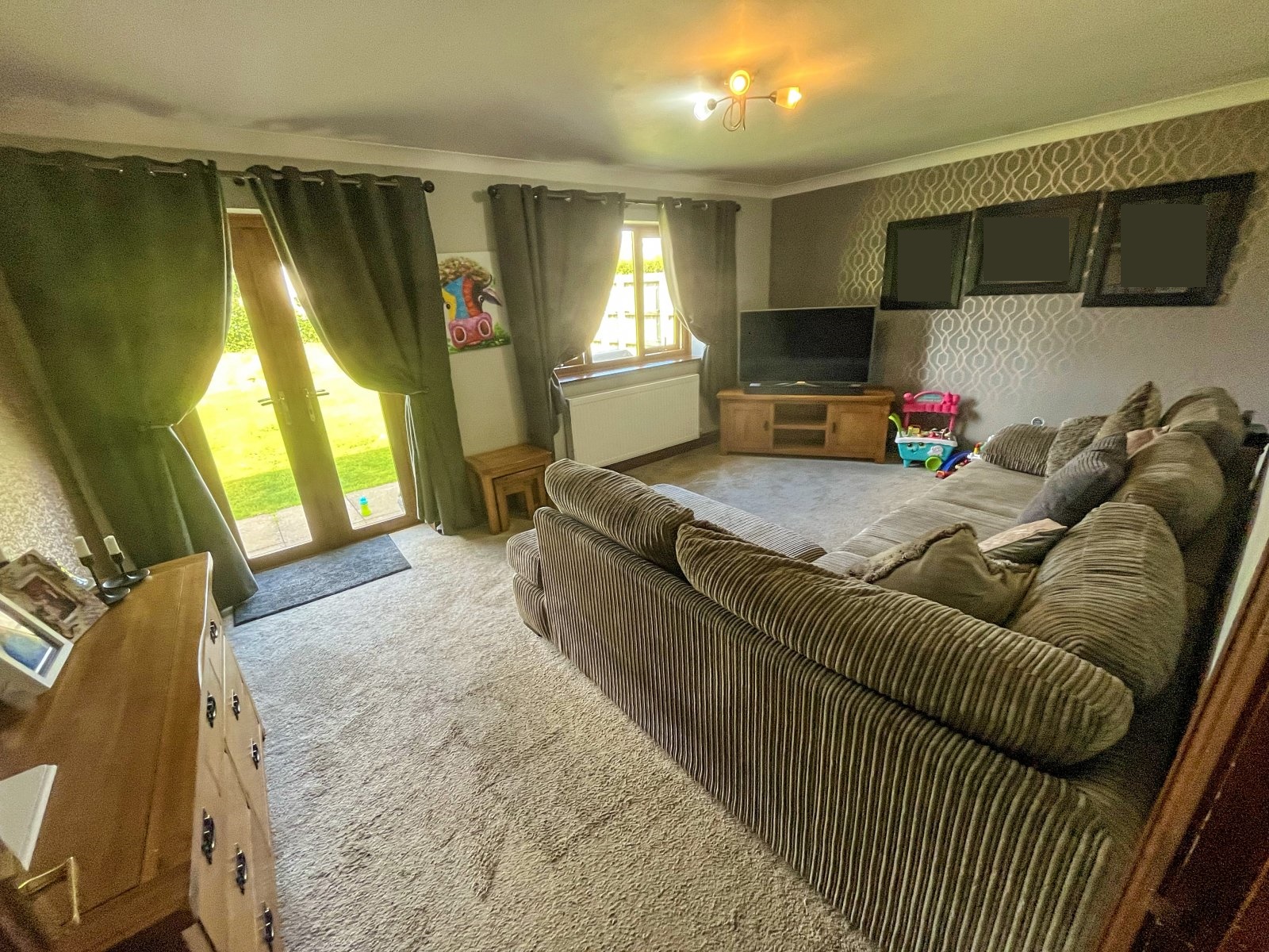 uPVC double-glazed window, uPVC double-glazed French doors giving access to garden, carpeted flooring, light fittings, radiator.