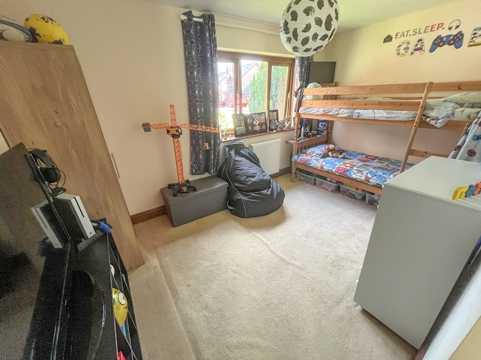 Carpeted flooring, light fittings, radiator, uPVC double-glazed window.
